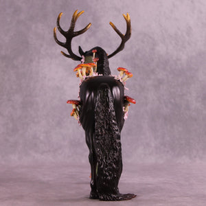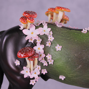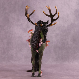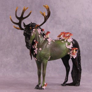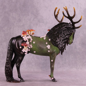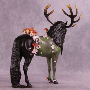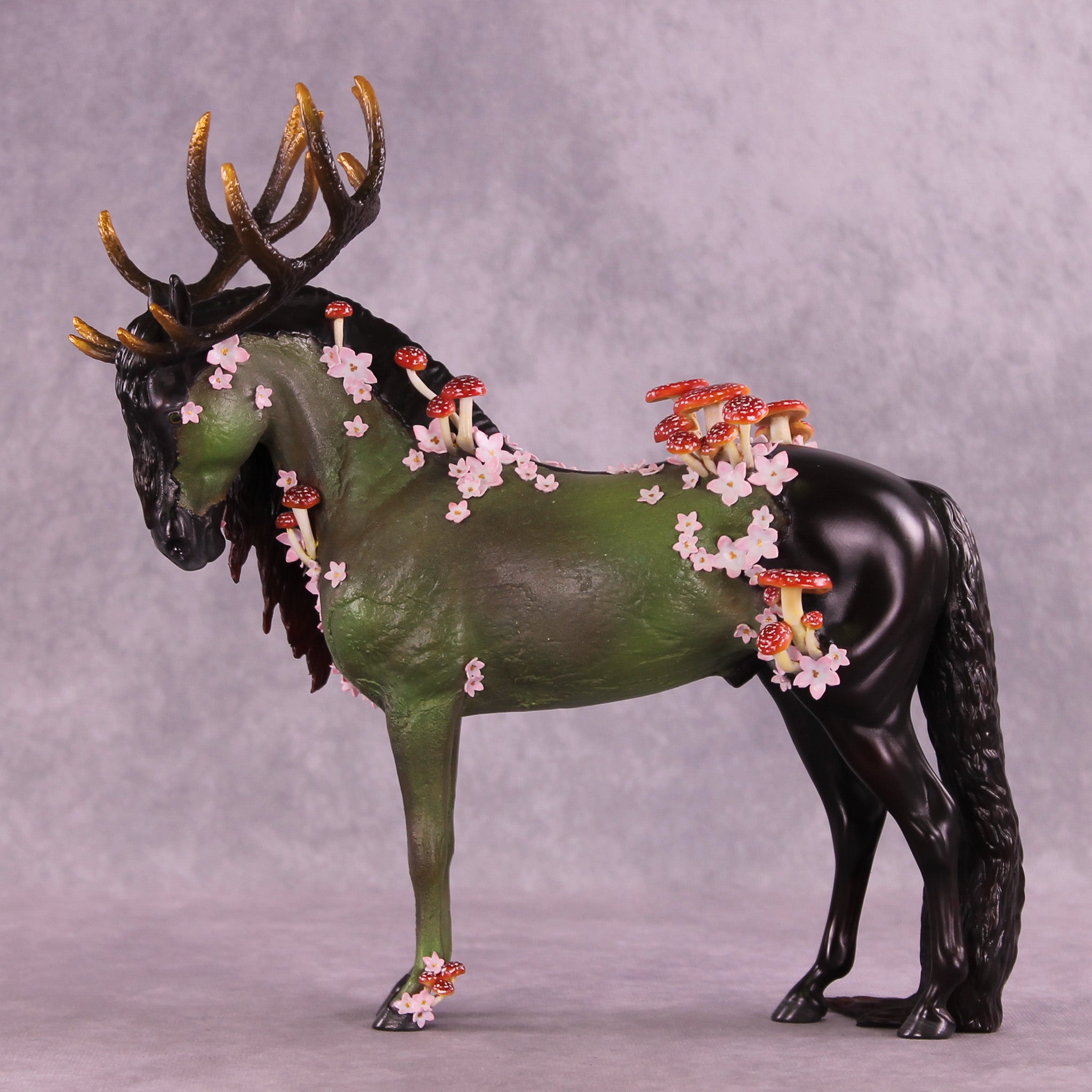 Mel had a vision for this piece from day one, and it was an honor to get to watch her bring him to life. Starting with our Andalusian sculpture, she gave him a textured makeover first, with parts of his living horse coat still smooth and shining. She gave him huge hand-carved antlers and then zillions of hand-built mushrooms and hand cut tiny white and pink flowers, plus a customized head and neck position and extra long mane and tail. She painted him to a forest sentinel with impeccable detailing and overall design aesthetic. He comes in matte and no finish changes are offered on this piece.