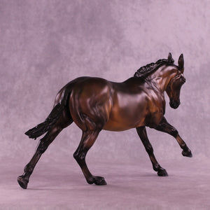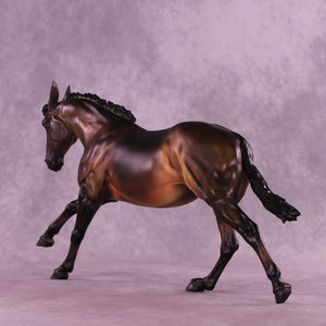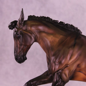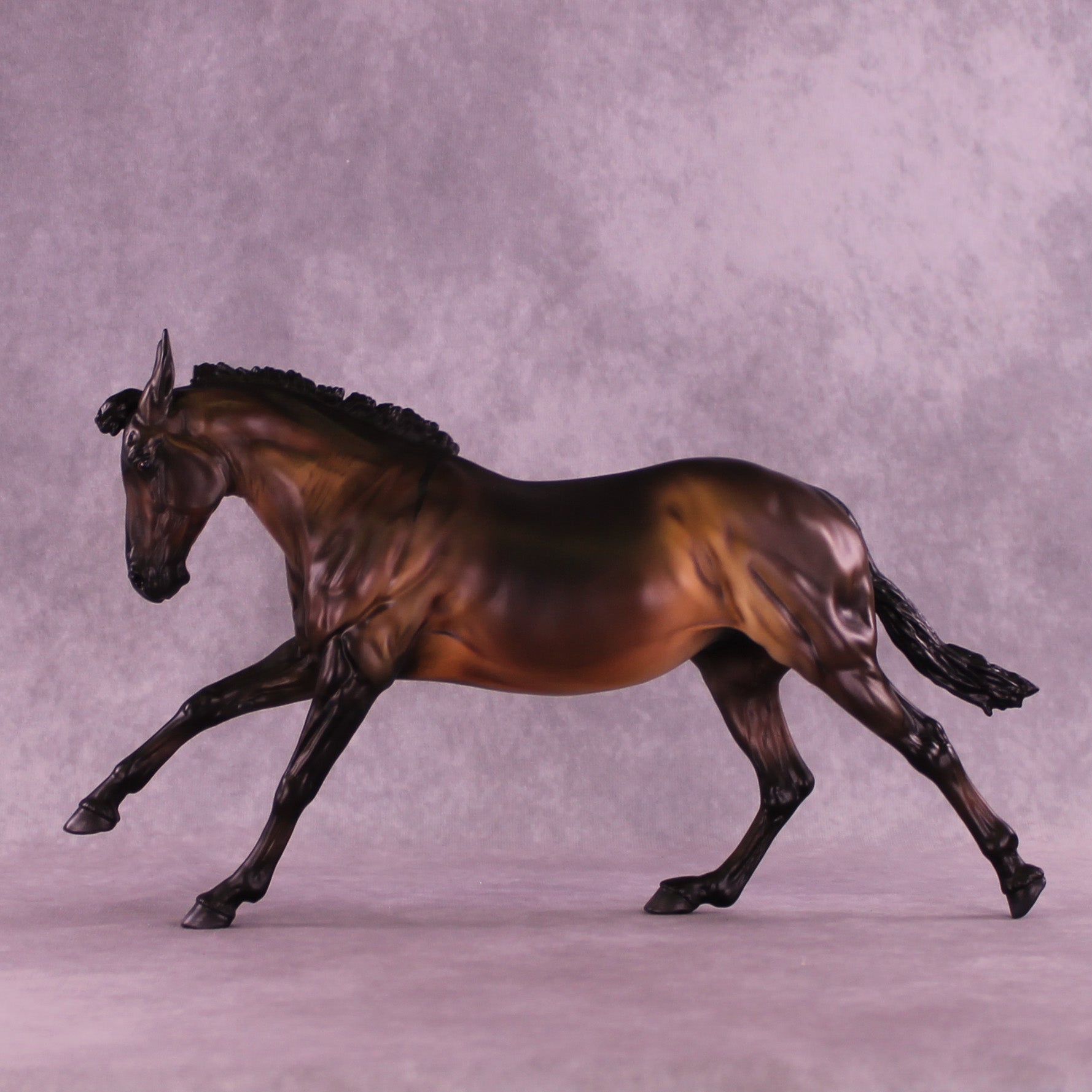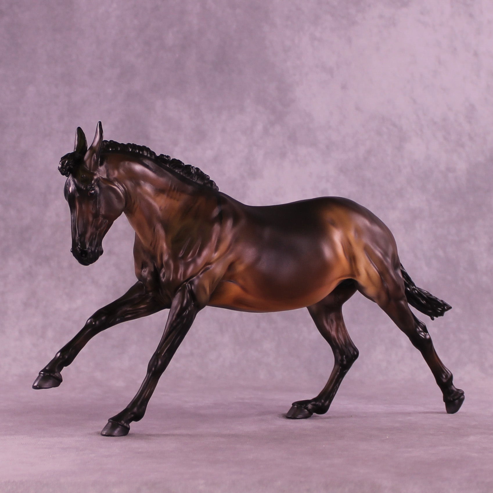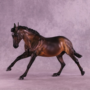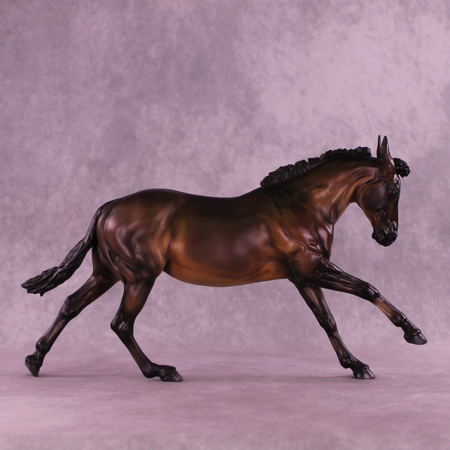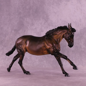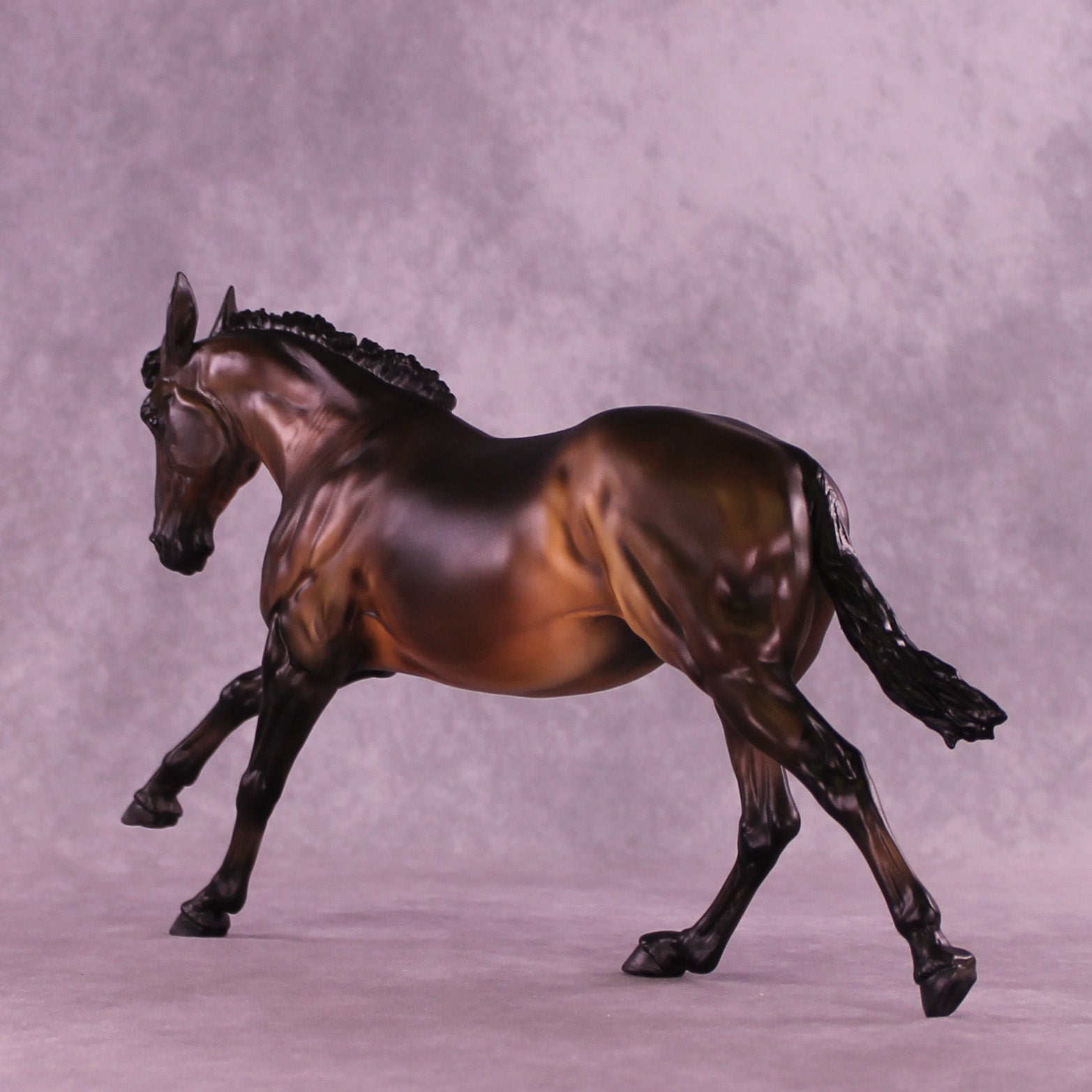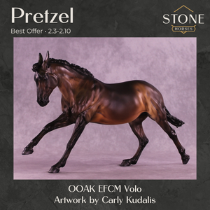 Pretzel is extra salty! This sassy Volo by Carly Kudalis has been reworked into a mule mare with pinned long ears (hand carved by Carly, these are not transplant ears!), a resculpted face and narrower mule feet. She also features a stubbornly tucked head with a short standing mane and a customized short tail. Carly painted her to a stunningly shaded dun with a dorsal stripe and primitive markings. She is sure to stand out in any Longears lover’s collection! Pretzel is finished in satin matte and no additional finish options are available.