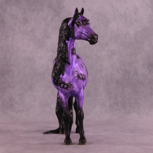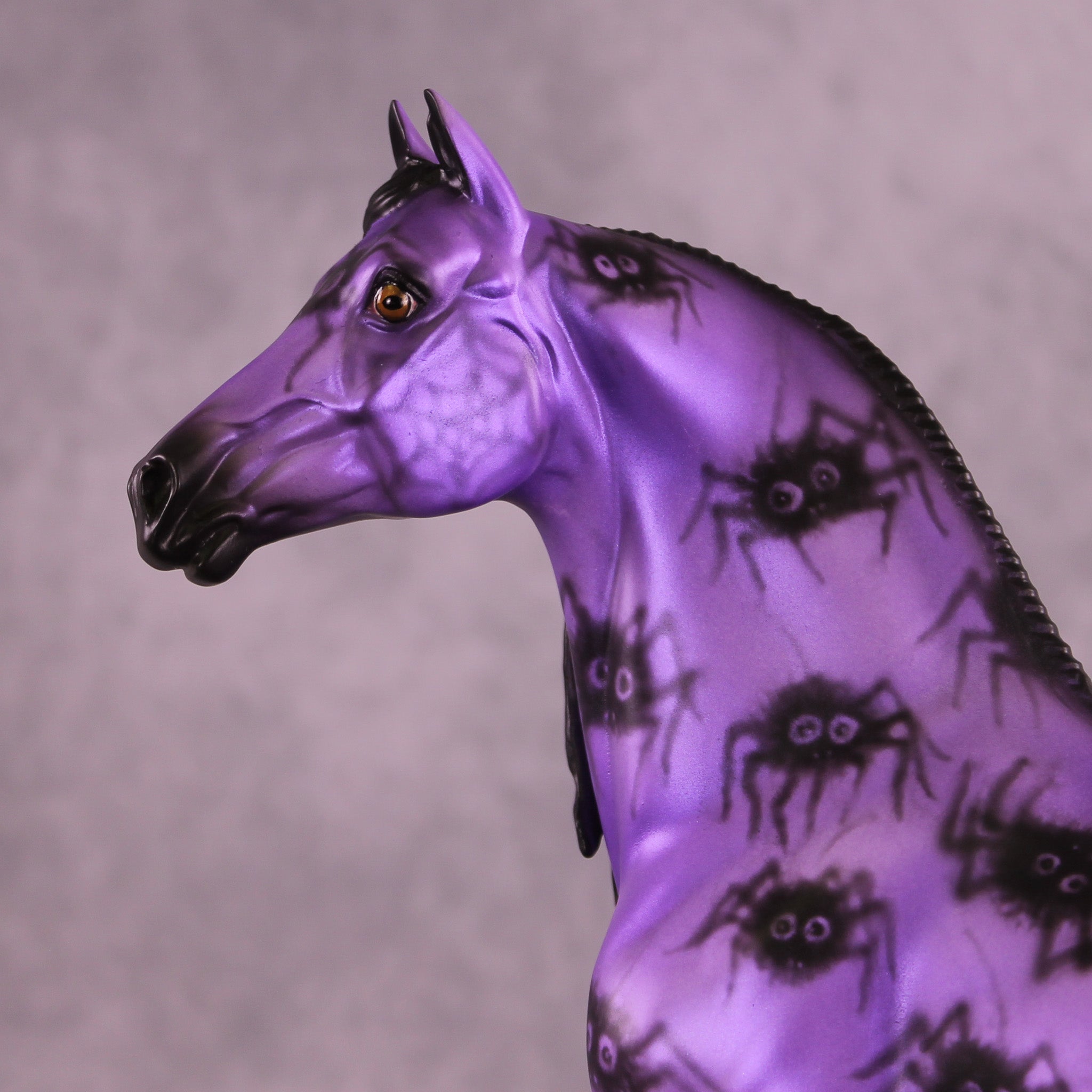 This group of Best Offers features THREE playful Halloween designs from Sheryl Leisure, and we could not be more thrilled! This one is depicted on our Morgan sculpture, customized with an extra long wavy mane, tail, and forelock. He is covered in the most adorable collection of spiders and spider webs all dancing together over a shaded black and purple coat. He is the perfect intersection between cute and spooky! All finish options are available on this piece.