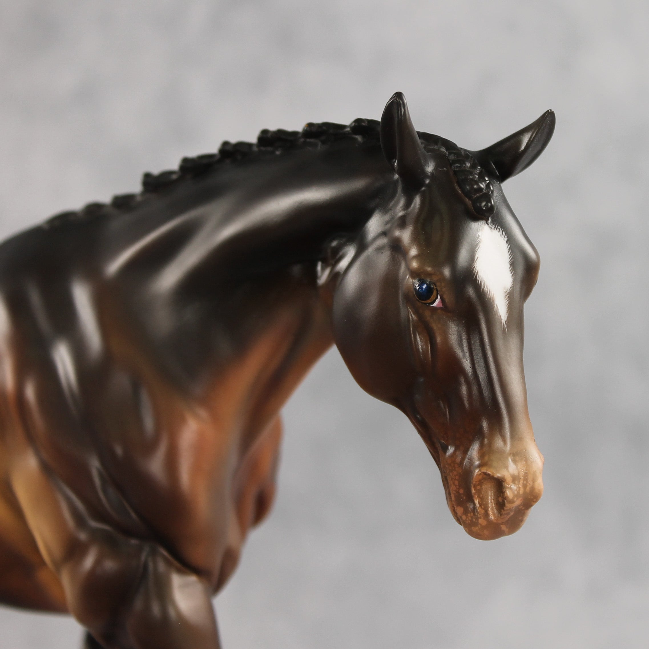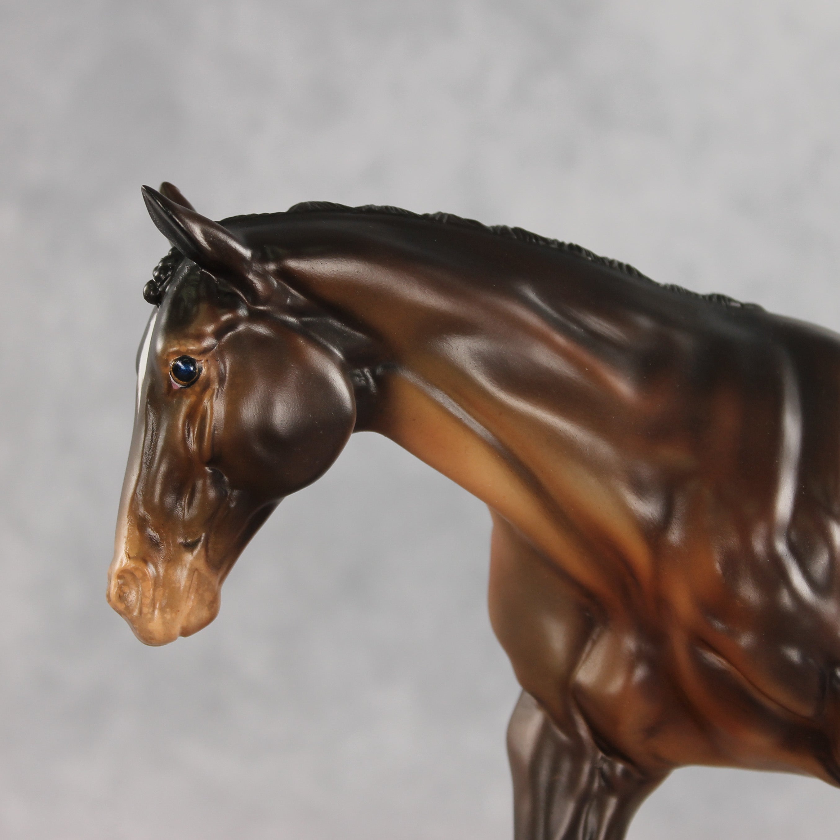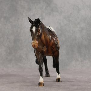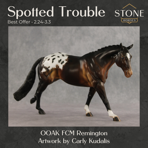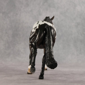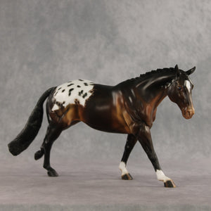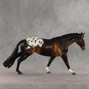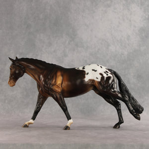 Spotted Trouble is on his way to make mischief – but in a handsome way. This Remington painted and customized by Carly Kudalis, features a stately button braided mane and braided show tail gently swishing to one side. His coat is a skillfully shaded dimensional bay with a shaded appaloosa blanket. Tons of small details like etched markings, mottling, and stripey hooves bring a realistic feel to this spotted gelding! He comes in a lovely satin matte and no finish changes are offered on this piece.