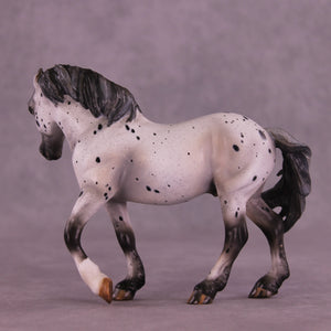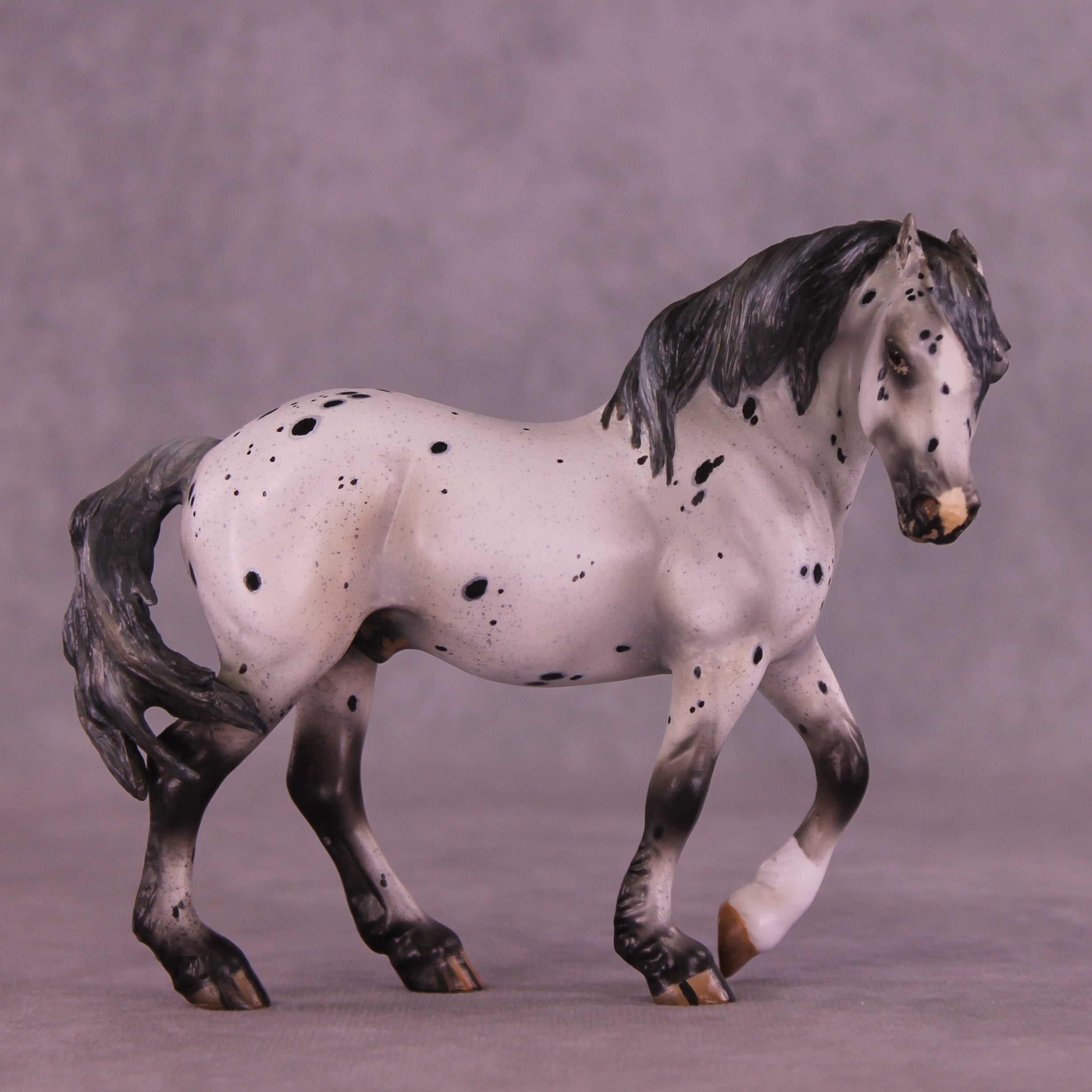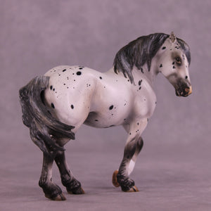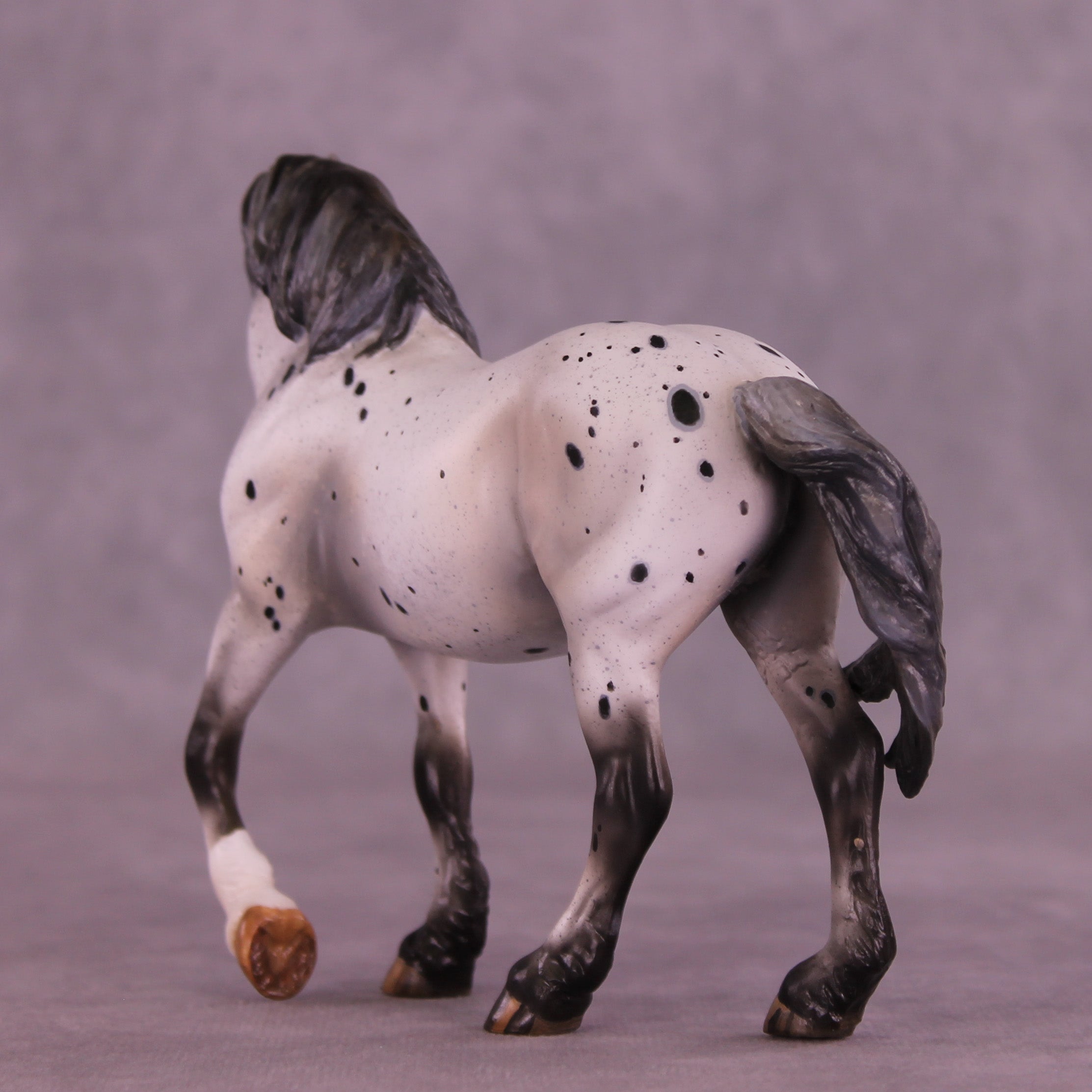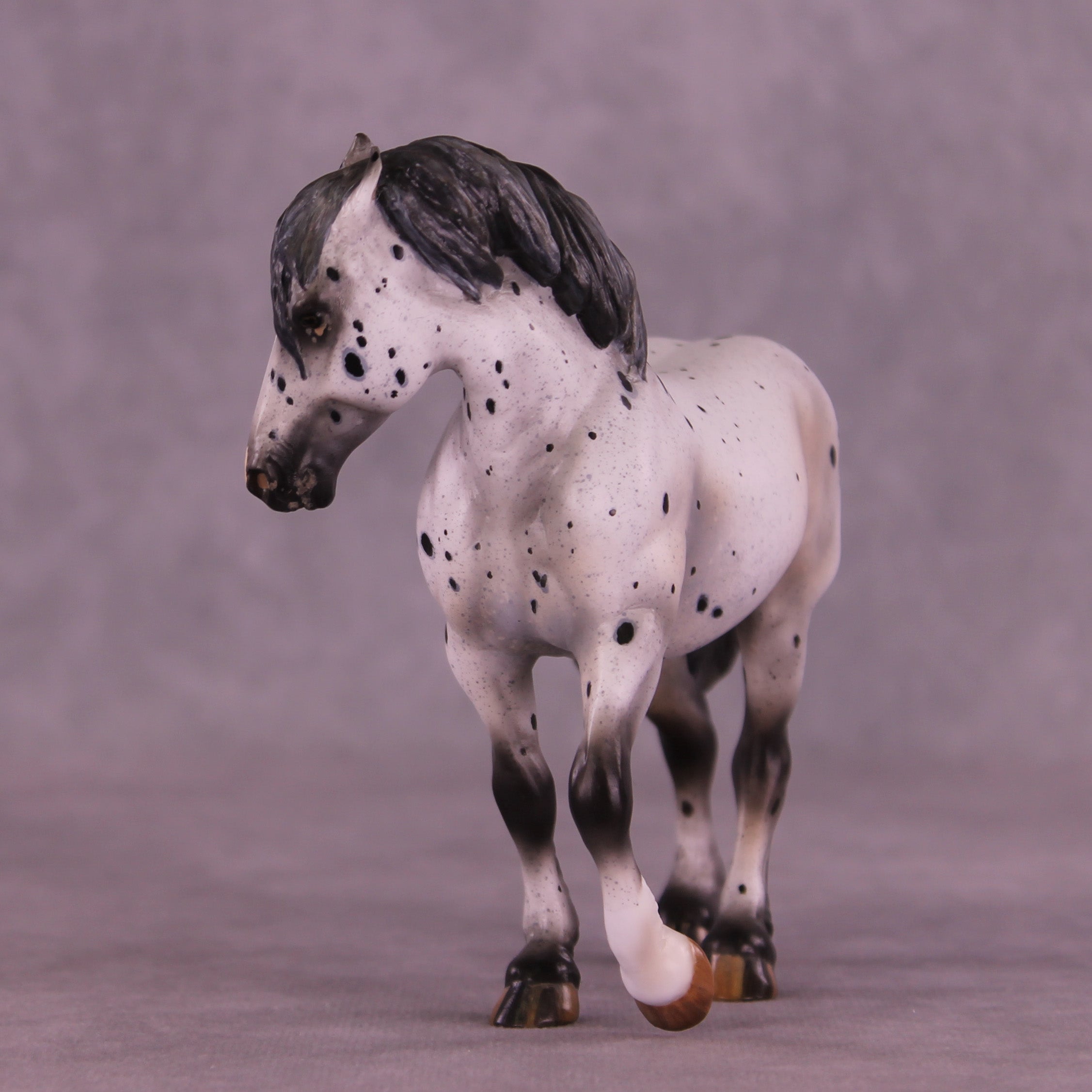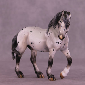 Straight to Jail - and for good reason! Kristen gave our Pebble Drafter a cranky extreme makeover in this piece, with a sassy tucked and turned head, pinned ears, and an adjusted gait with several leg movements and a whole new customized mane, tail, and forelock to give him a whole new look. She did not leave any stone unturned for his paint design either, choosing a dramatically detailed shaded leopard appaloosa, with loads of skin mottling, striped hooves, hand painted detailing in his mane, haloes on his spots, and more. He is offered in a soft matte finish with no finish changes available.