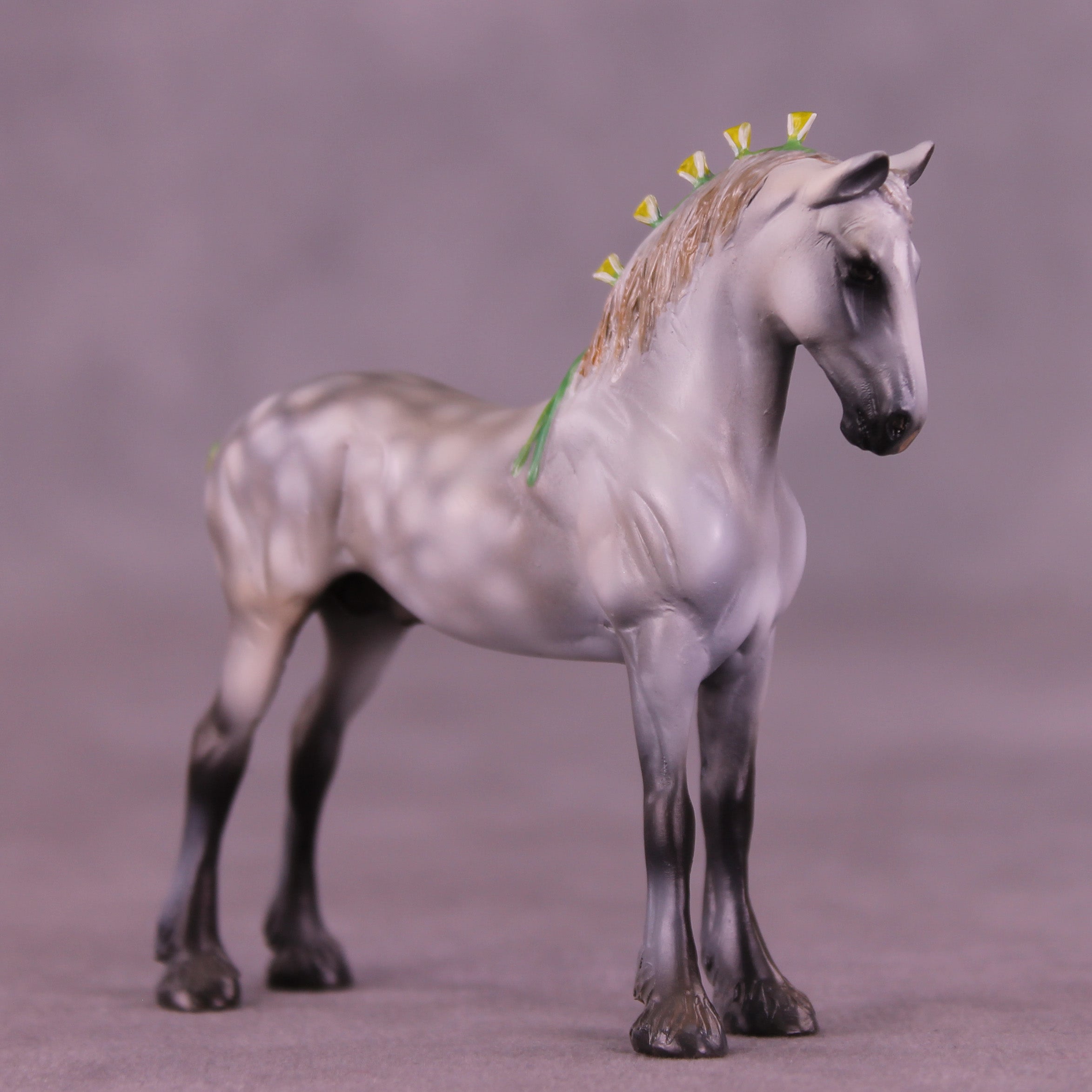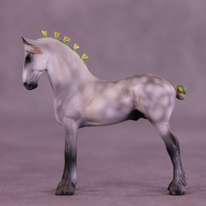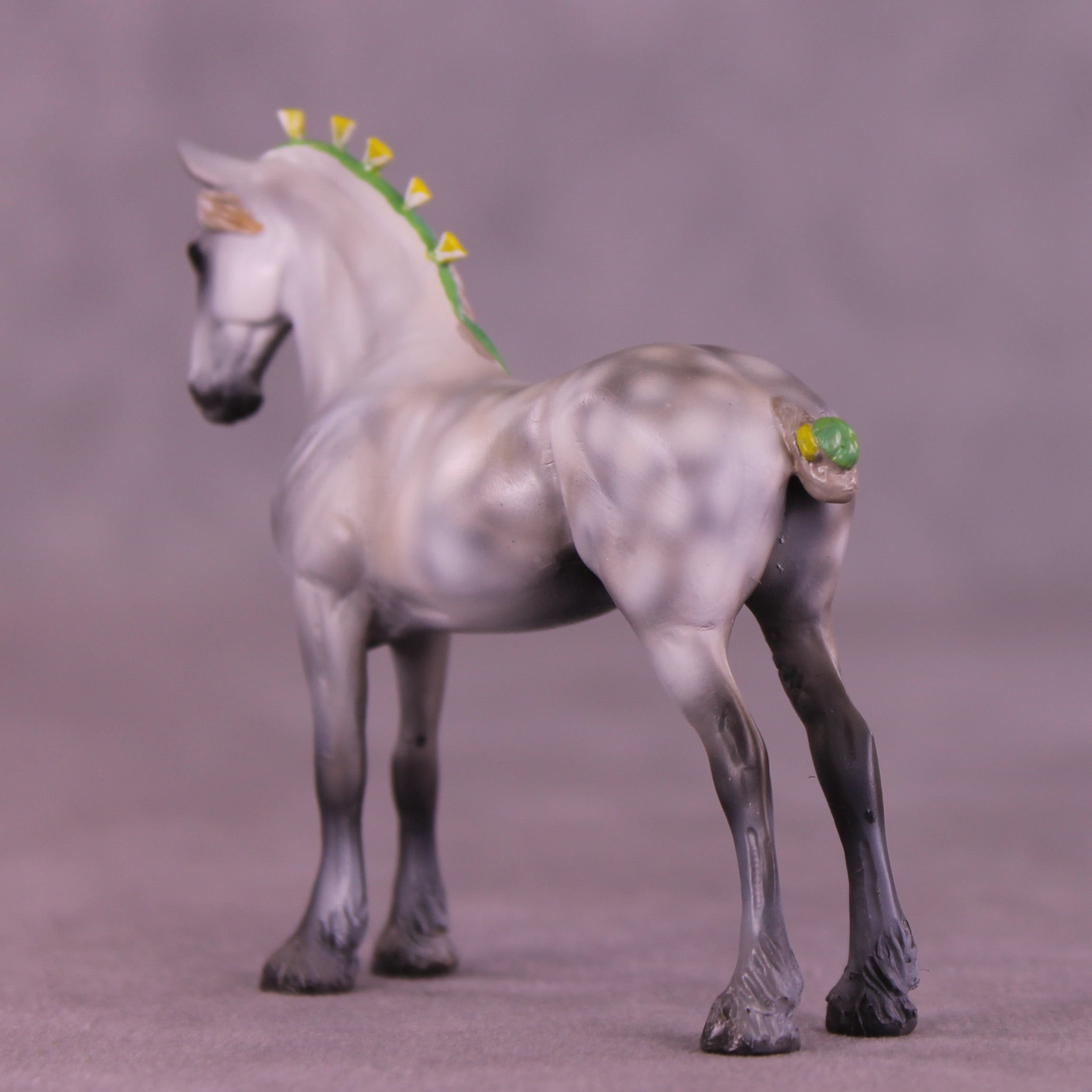 Kristen went to town on our Chip Drafter for this piece, giving him a dramatic extreme customized tucked and straightened head and neck, a trip to the clippers to remove a lot of his feather and resculpt his hooves, customized added mane flights, and more. She painted him to a stunning warm dappled grey with lovely shading throughout, and intricately hand painted green, yellow, and white mane flights and ribbons and an etched star. he is offered in a lovely matte finish with no finish changes available.