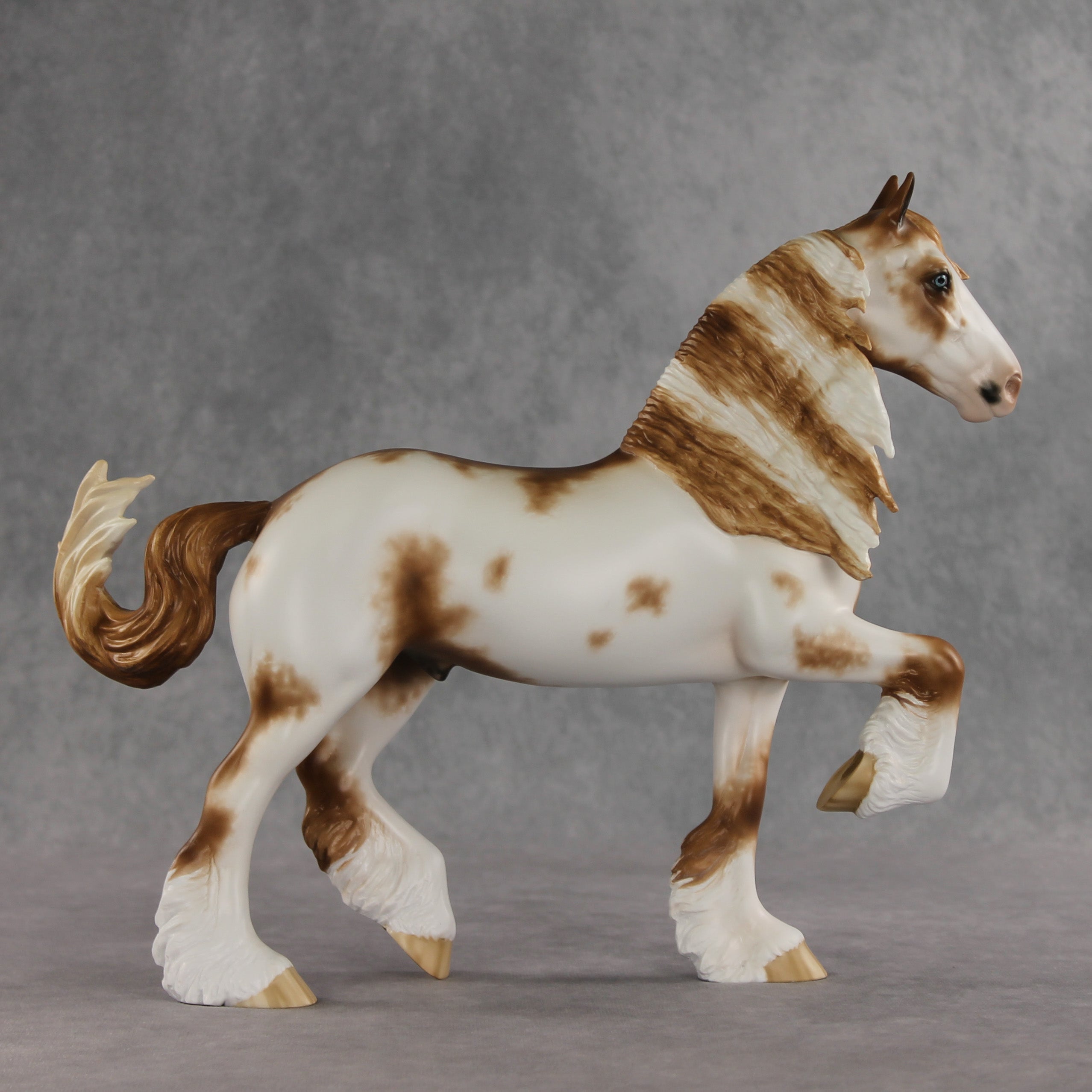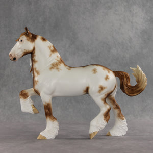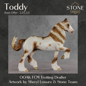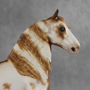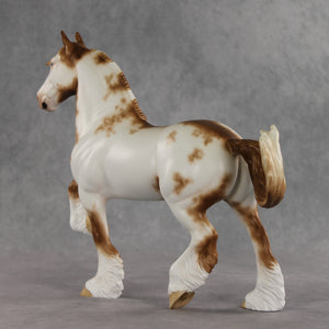 Toddy is here to warm up your winter days. This sweet guy starts out with the Trotting Drafter mold, customized by the Stone Horses Team with a lovely long, wavy mane and playfully swishing tail. Sheryl then painted him to a handsome chestnut sabino with soft texture throughout his lacy white markings. Charming blue eyes and kissy spots give him extra personality! He is finished in matte with additional finish options available.
