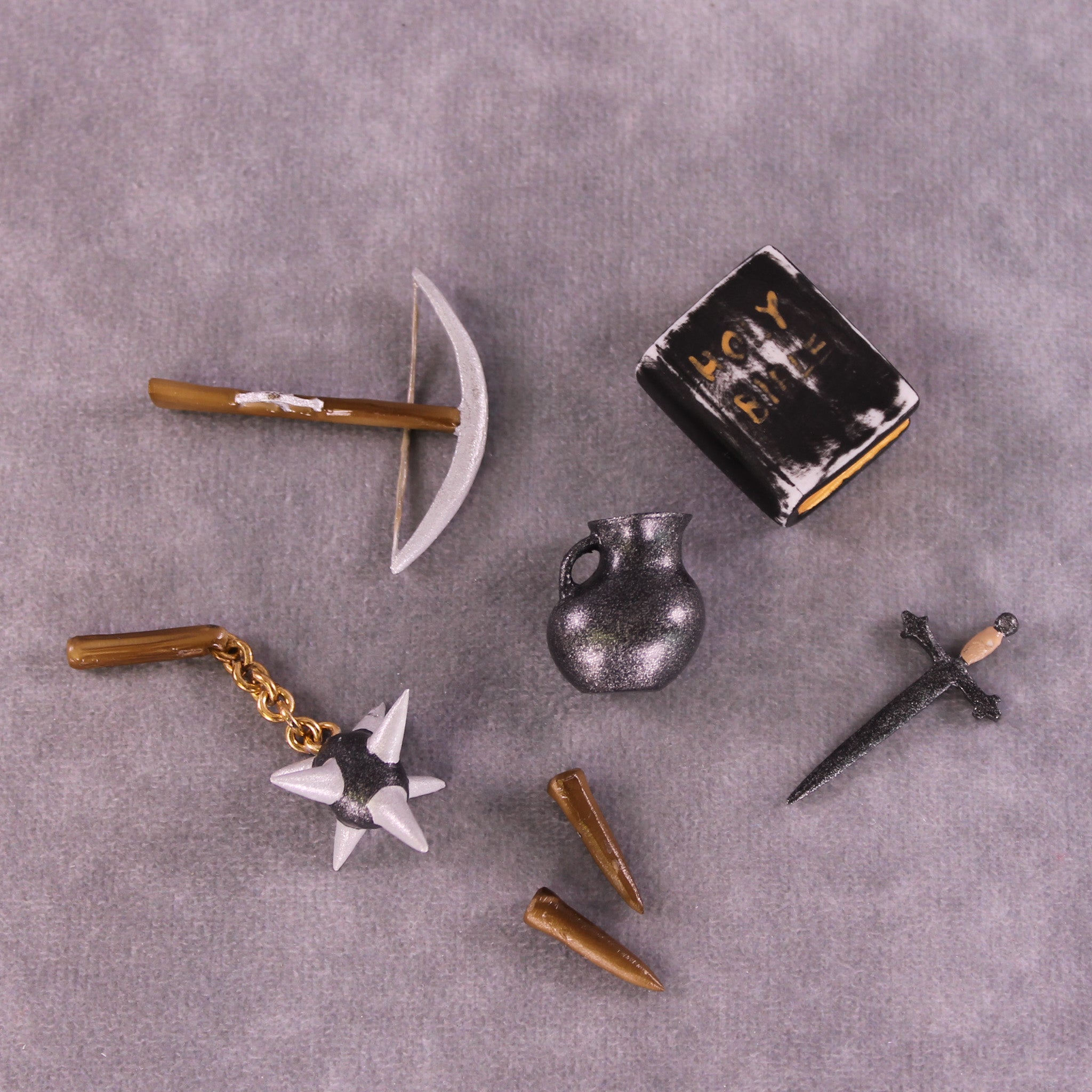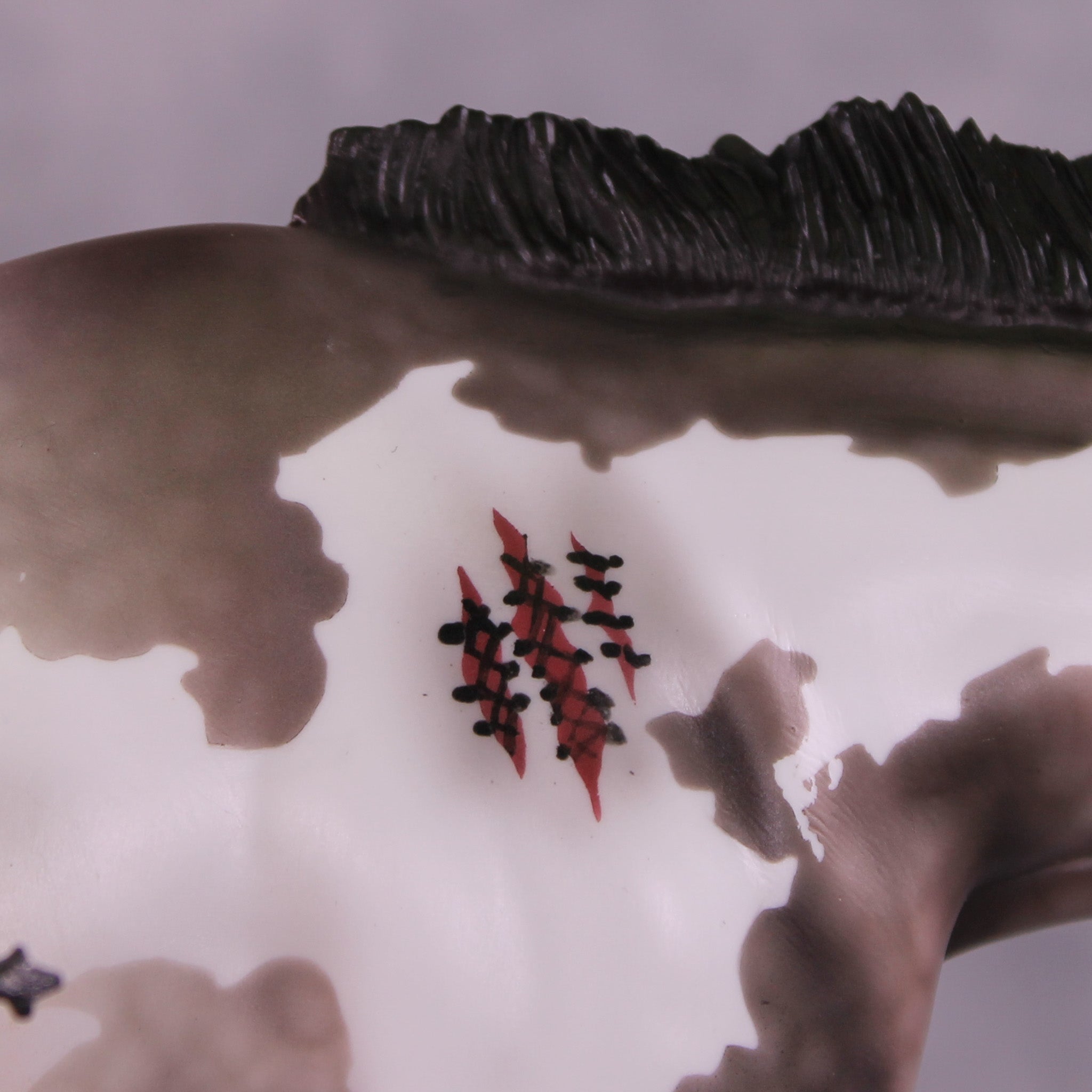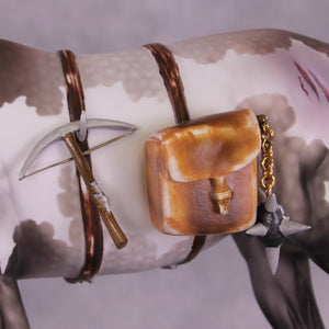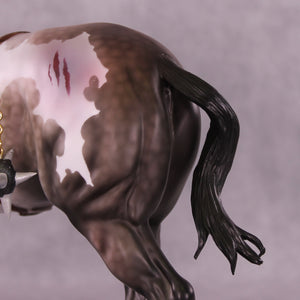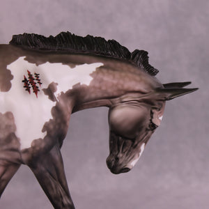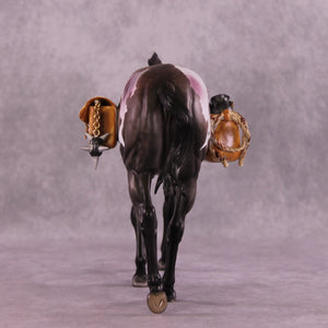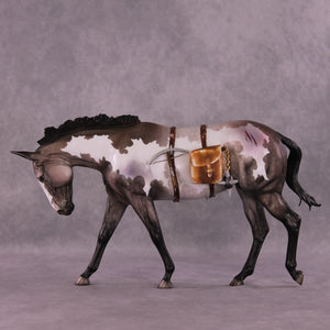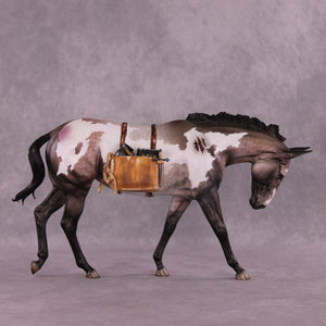 When you are headed out to hunt vampires, you need a reliable sidekick. A creature who has your back, literally and figuratively. Who can watch the tree line and carry your morning star. That’s where Vanna Helsing comes into the picture. Matt gave her a dramatic tucked head and new customized swishing tail, plus a hand-built pannier tack set complete with all the tools of battle. The panniers are permanently attached, and they and the tools in them are all made from our plastic, with some metal chain built in as needed. Who needs an OF Crossbow? You do. She comes with her crossbow and two stakes, a cross dagger, a chained mace, a well worn and often needed bible, and a vessel for holy water, of course. Dawn painted her to a rough and ready dark dapple grey pinto, with stitched wounds and bruising. She has been through it, but she remains ready for what’s next. No finish changes are offered on this piece.