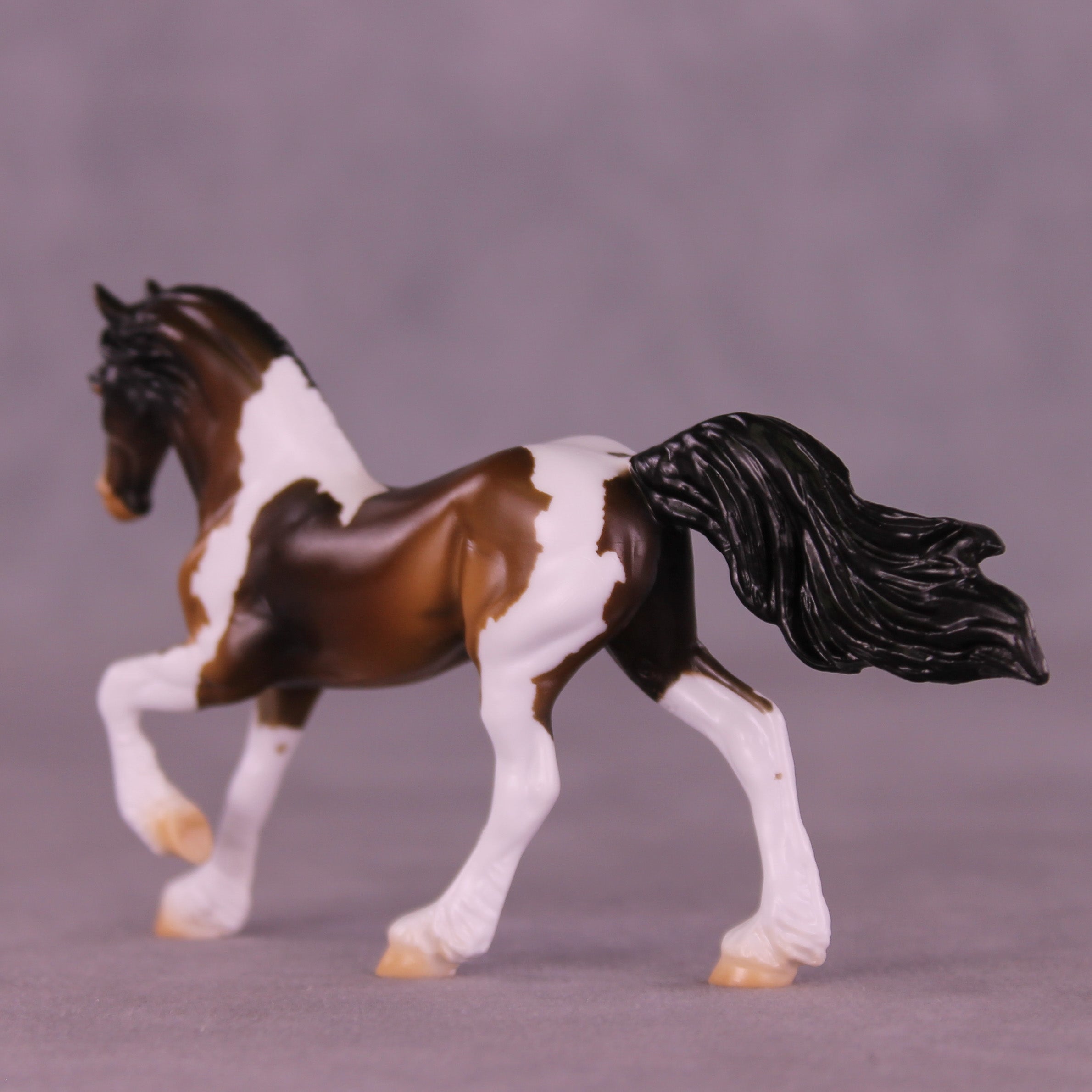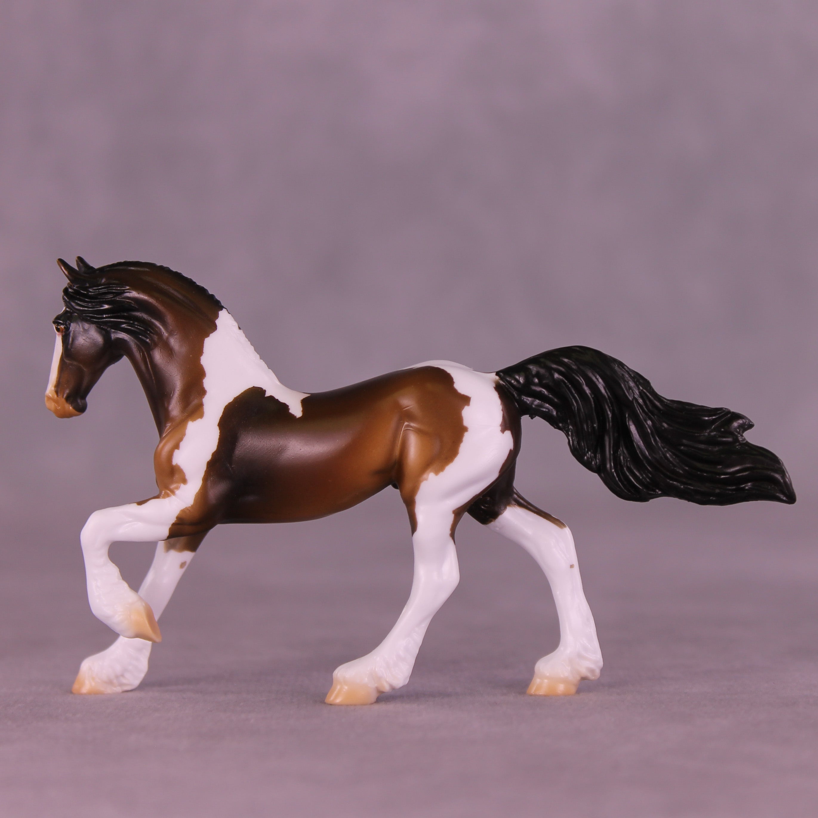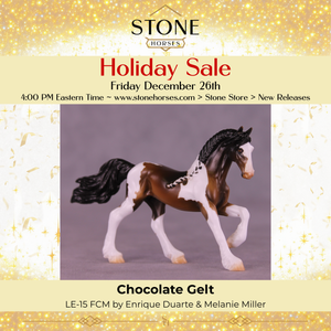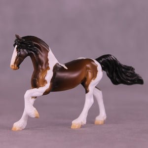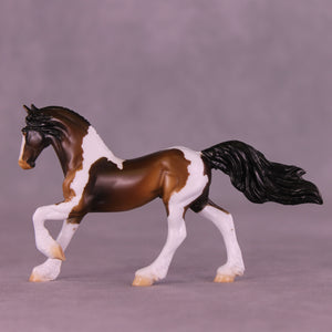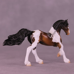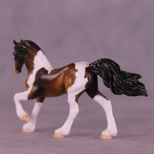 If you could have chocolate coins in your stocking or Chocolate Gelt, we know which one we would choose! Mel worked with our Chip Friesian mold to give him a whole new intricately carved and super detailed long running braid, with a customized braid tendril running down his body and a repositioned high and flying tail. Enrique painted him to a stunning bay tobiano pinto, with hand-painted white and black braid tendrils flowing in his braid pattern the whole way through! He is available in all finish options.
