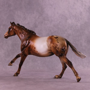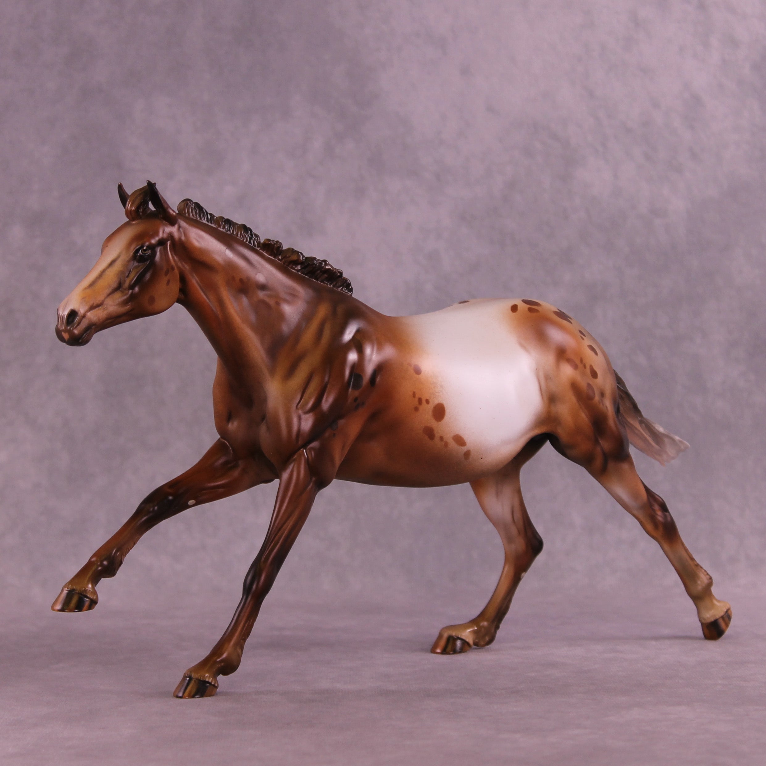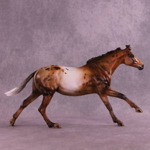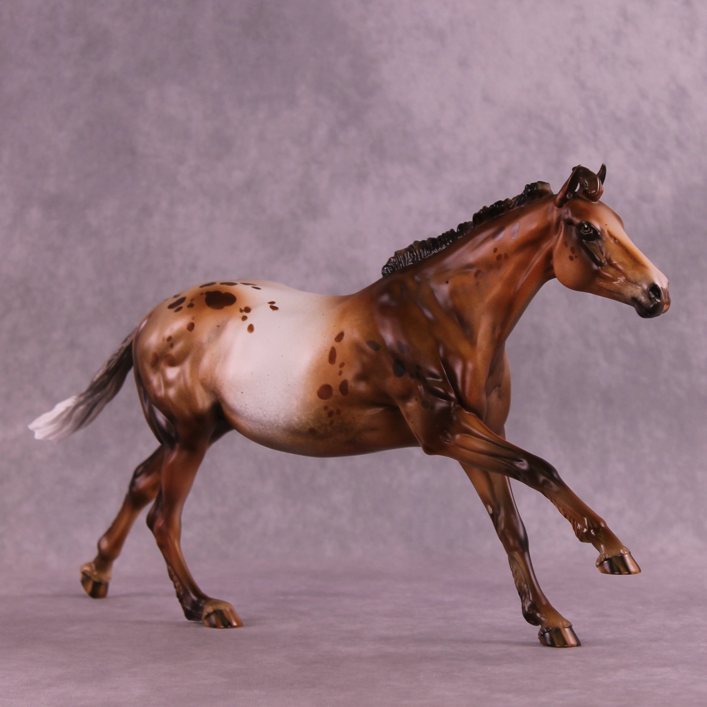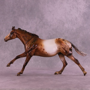 Places to go, people to see, gifts to buy - it's a Christmas Rush! Volo always gets where she needs to be - and early. George gave her an expressive attentive face with her clipped ears customized pricked forward, plus a short standing-up appy mane and sparse tail carried low and flowing. Julie painted her to a gorgeous chestnut varnish appaloosa with mottling, hoof stripes, a delicate nose snip, and loads of extra detailing! She is available in all finish options.