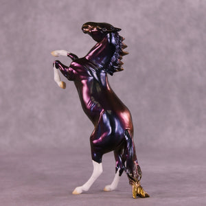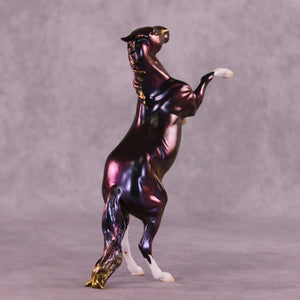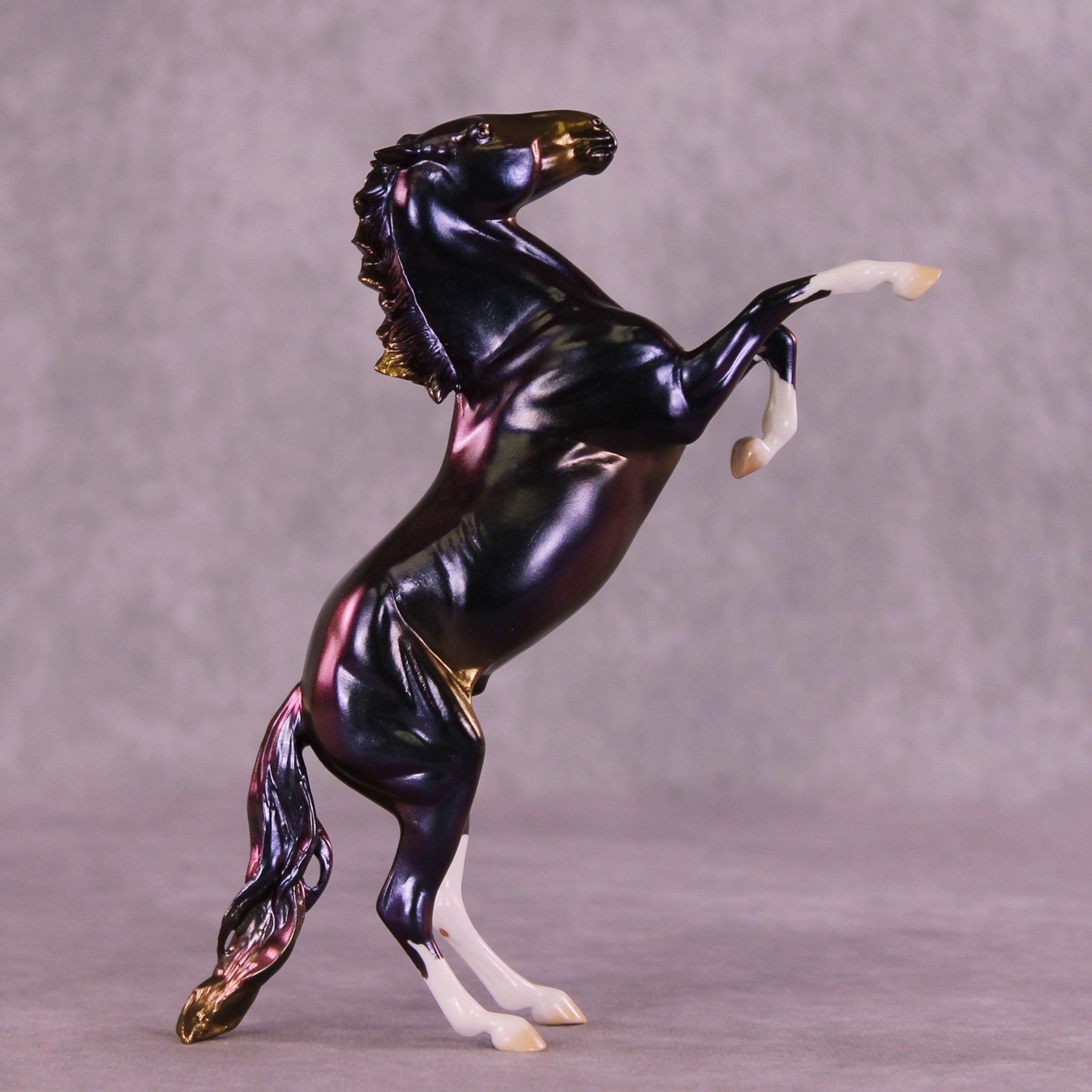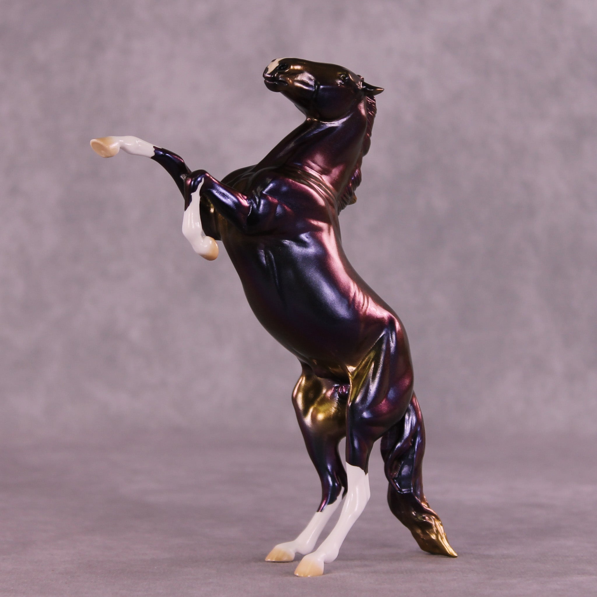 Matt worked with our Pebble Mustang sculpture to create this new take on a classic pose! He has customized front legs to be in a matching tucked position, and a sassy head and neck turn that changes his whole outlook on life. Ellen painted him to a gorgeously detailed dun with a dorsal stripe, leg barring, and dramatic shading through his whole design. He is available in all finish options.