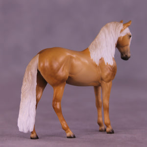 When we were planning this event, Mel made us two possible customizations on the Chip Andalusian to pick from - and, well, we loved them both so much that we picked both! This lovely guy features a big dramatic customized tucked head with a slight turn, with his ears left forward attentively listening. Ellen painted him to STUNNING dappled palomino with gorgeous shading that does a wonderful job of highlighting this lovely little sculpture. His mane and tail have creamy realistic shading, and he has no white markings - an ideal Andalusian. He is available in all finish options.