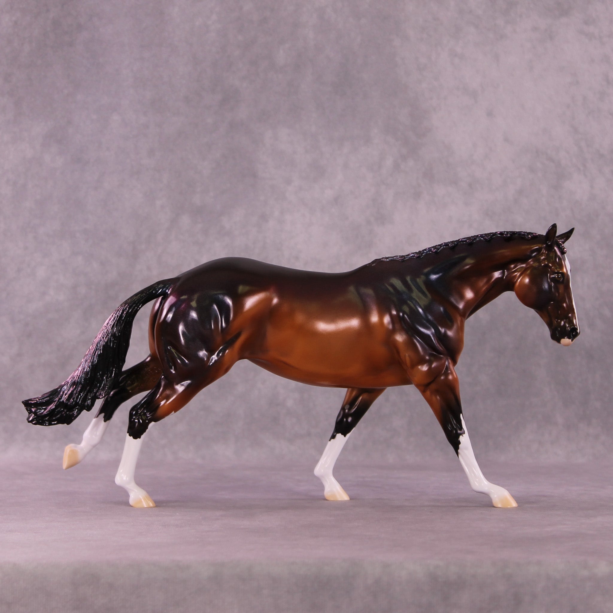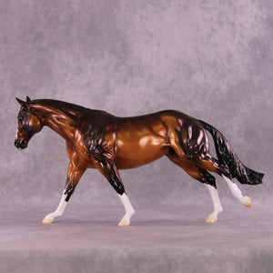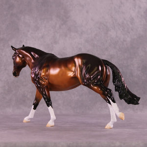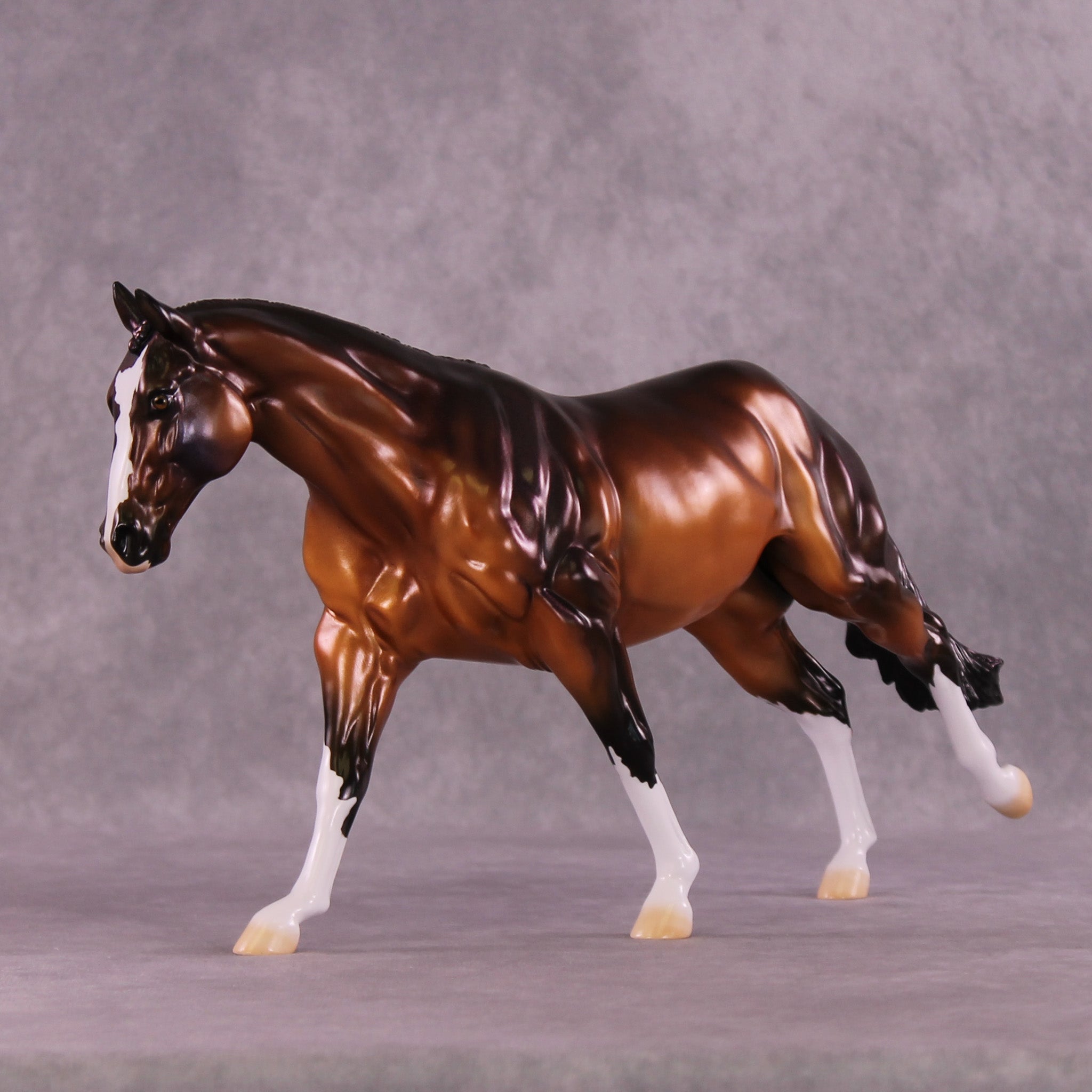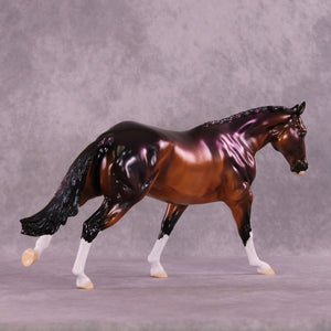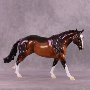 This guy is Owen’s online identity – Ellen painted him in the same gorgeously shaded copper shining bay, with a blue/purple color shift cast over his topline. He’s Owen – with a little something extra! He sports a braided mane and loose tail by Mel, so he lets his hair down in his online version – but only a little bit. This guy comes in heavy satin/gloss and no finish changes are offered, he would lose his magic if he’s not shiny!