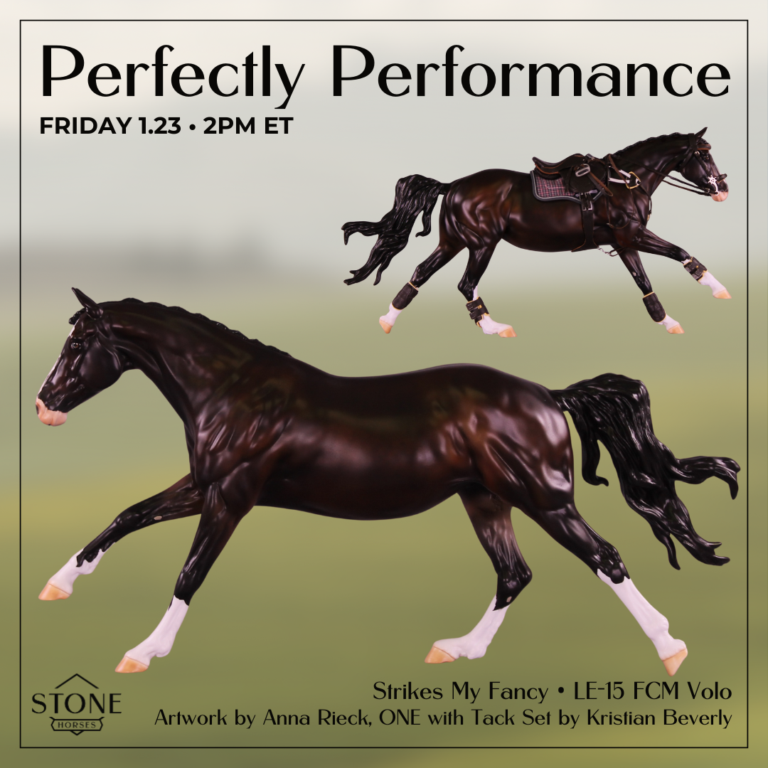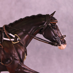 The brainchild of one of our newer artists who is also very active as a model horse exhibitor, Anna Rieck – this line celebrates the artistry that goes into a world class performance entry! Each month we will be offering a model that has factory customization and paintwork designed by Anna to make it specifically excellent in a performance event – plus a huge bonus! Each month’s model will have just one tack set made to fit it perfectly, and that tack set will be randomly included FOR FREE with one lucky buyer’s model.