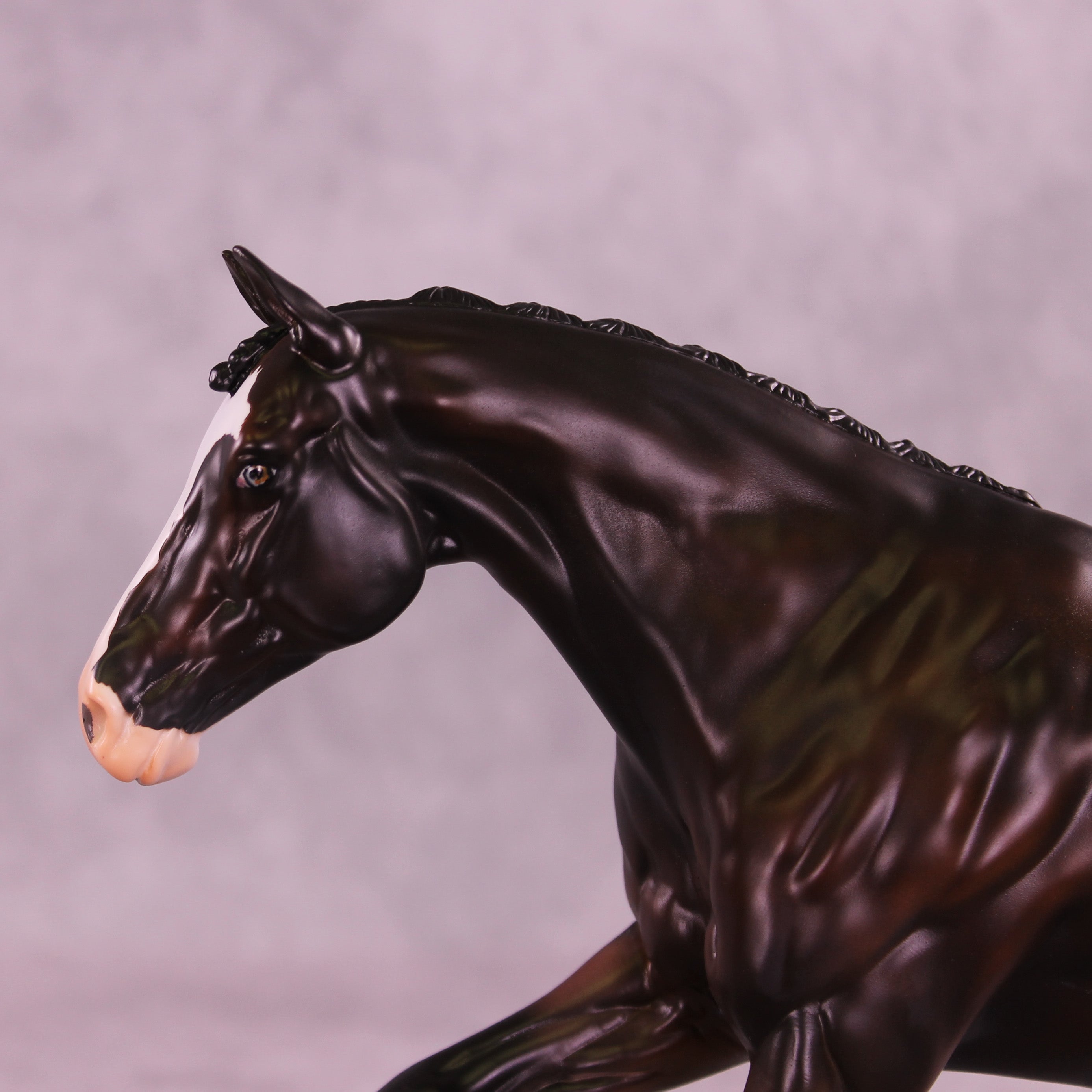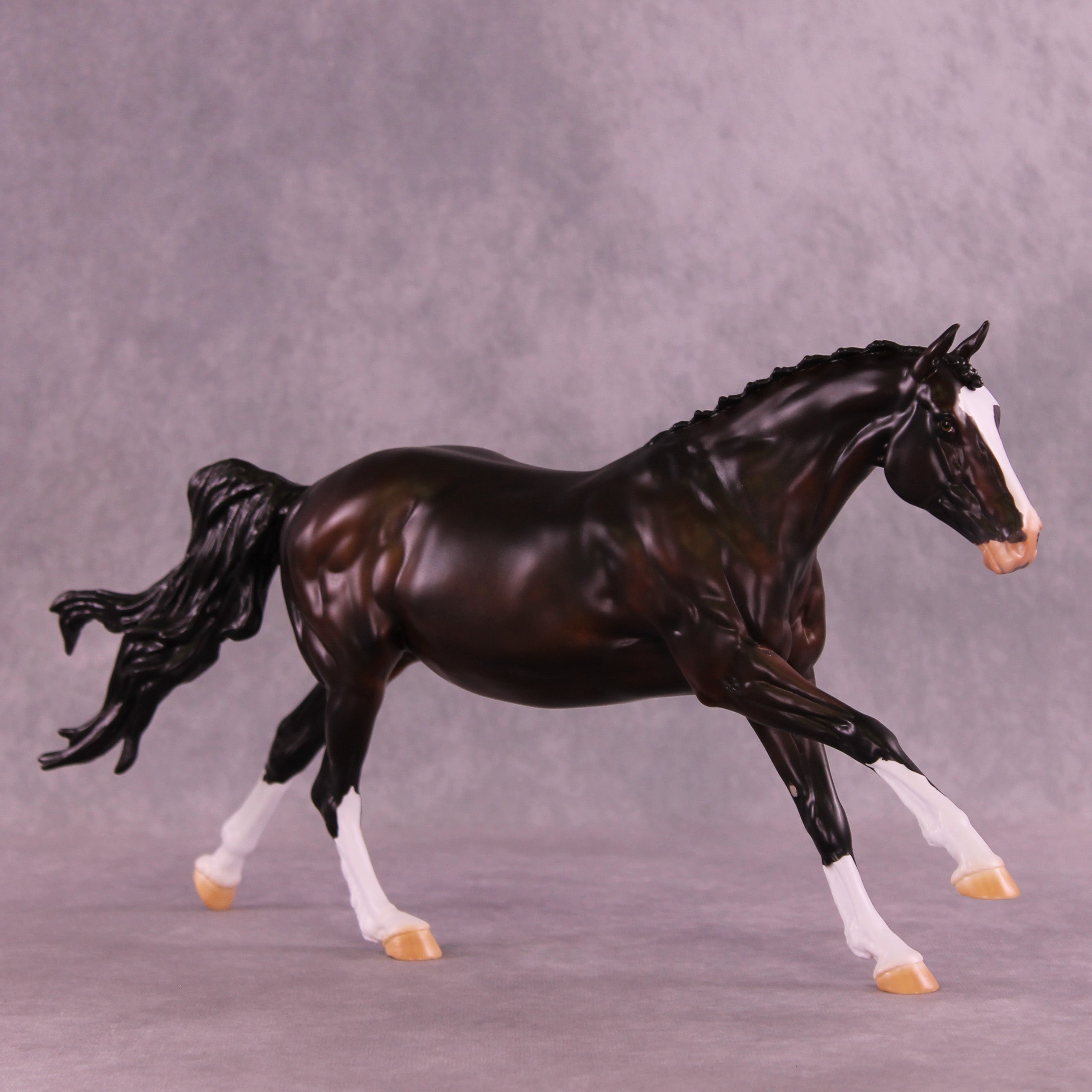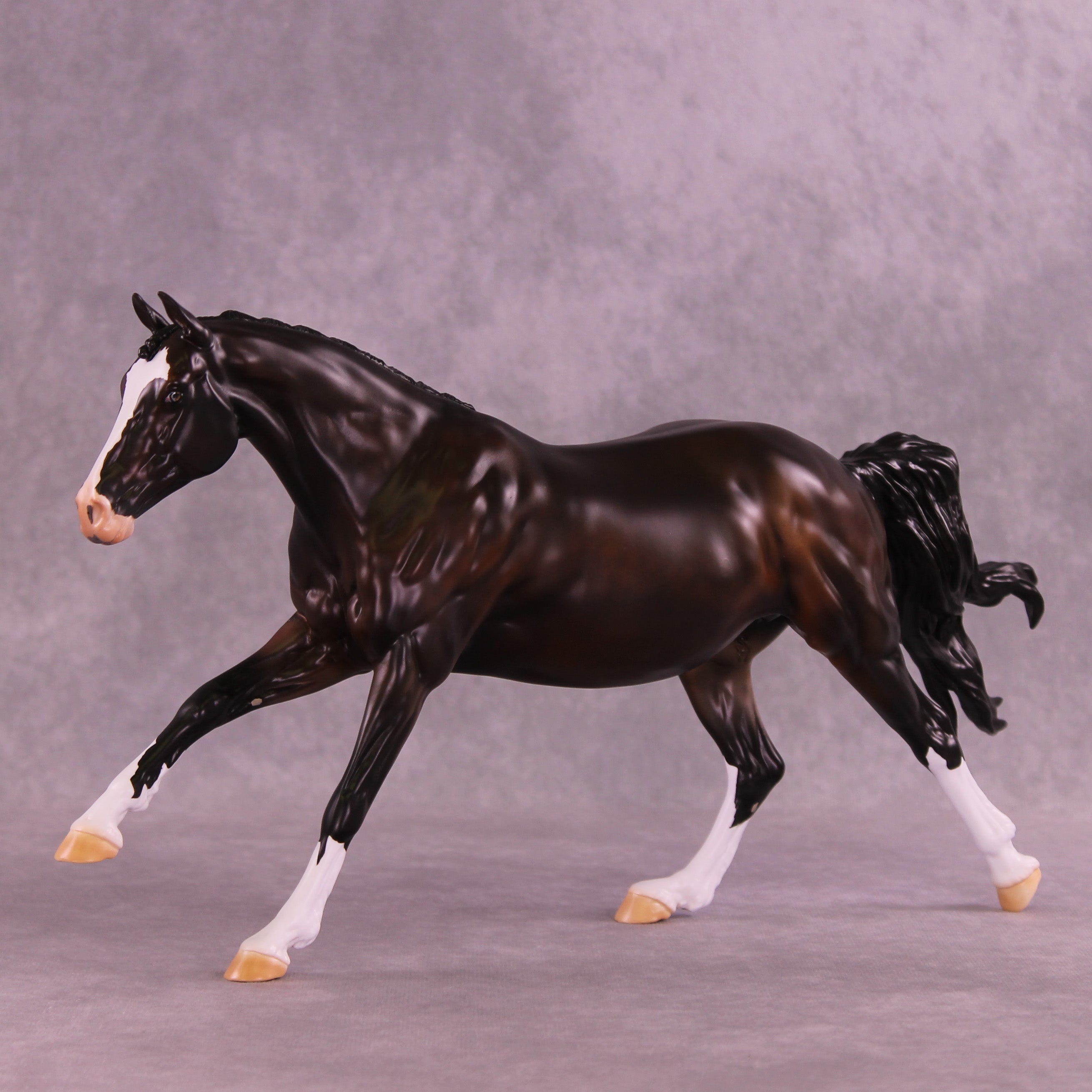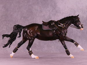 This month, Anna has designed a gorgeously customized Volo that is ideal for a cross country setup! Carissa has given her a tucked head and neck, a lovely braided mane and forelock, clipped ears pricked forward attentively, and her loose flying tail. Anna painted her to a stunning deep dappled bay with four white socks, a wide blaze that goes up under her chin with a kissy spot on her nose, a little sabino belly spot, and Andrea on our detailing team has given her one brown eye and one eye that is half blue and half brown! She is a short term pre-order expected to ship in the next few weeks.
