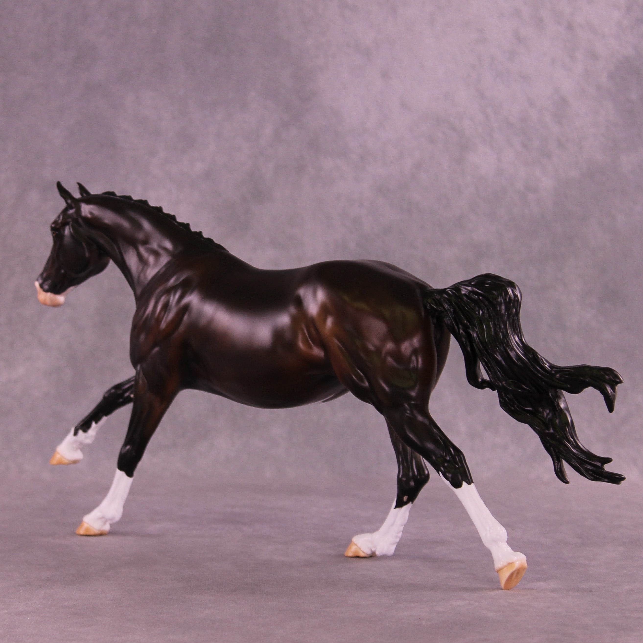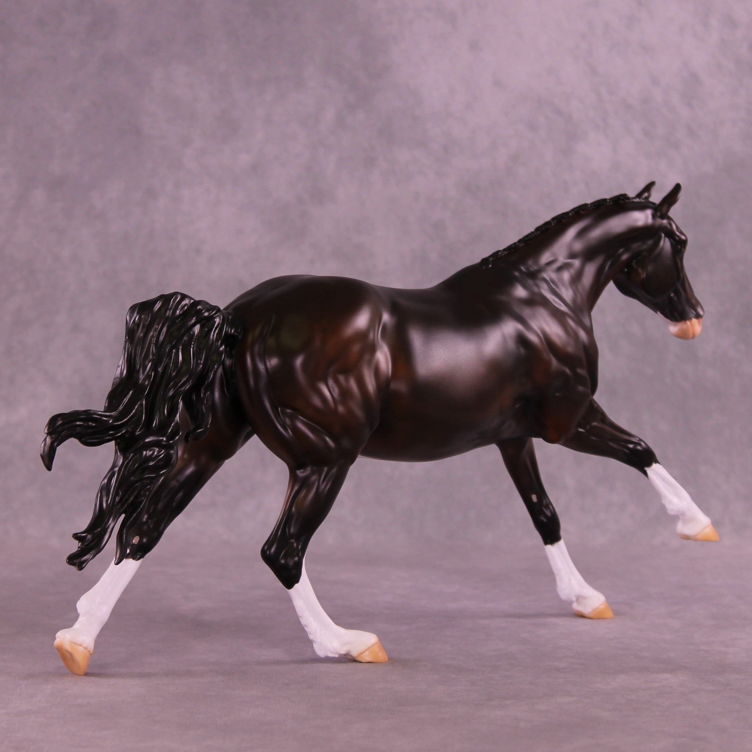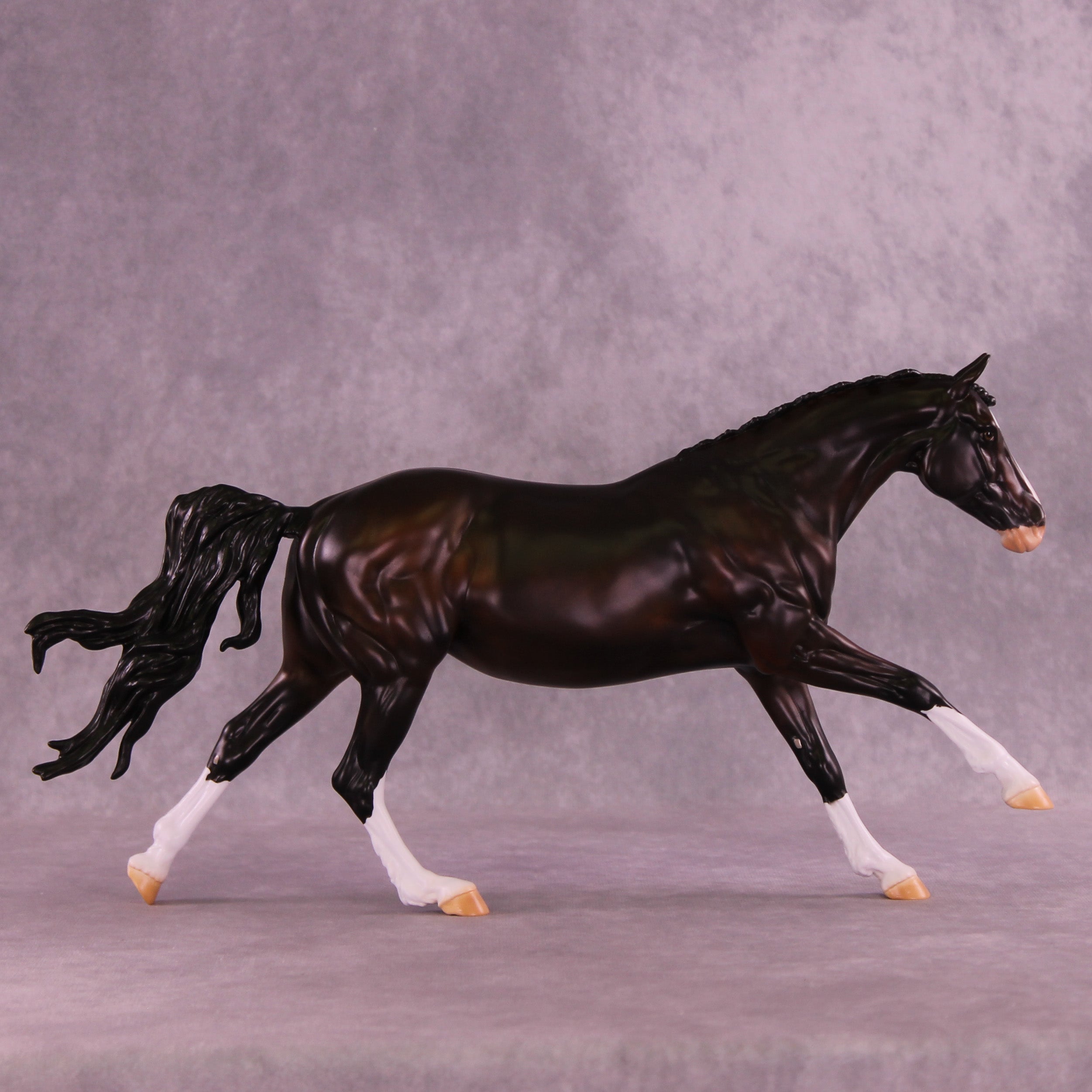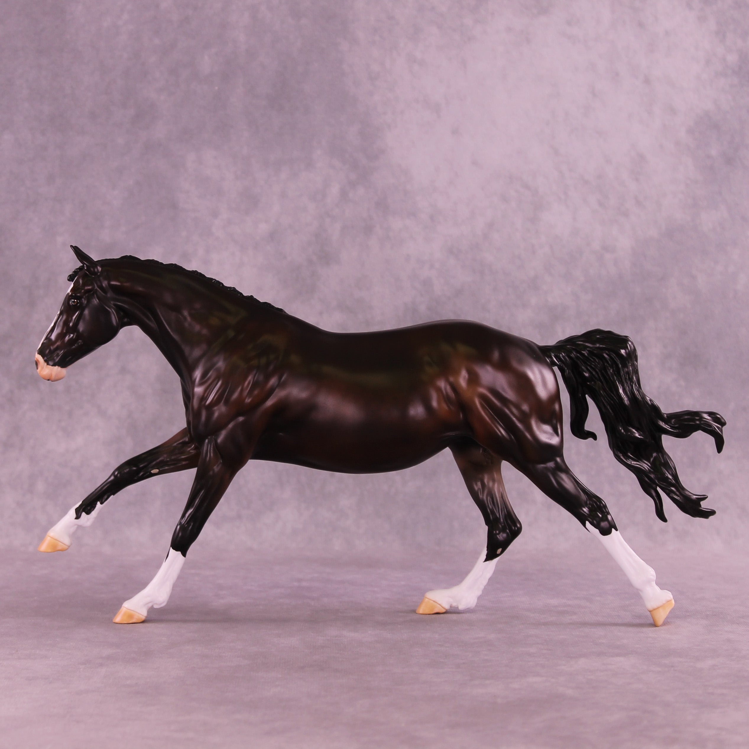 This month, Anna has designed a gorgeously customized Volo that is ideal for a cross country setup! Carissa has given her a tucked head and neck, a lovely braided mane and forelock, clipped ears pricked forward attentively, and her loose flying tail. Anna painted her to a stunning deep dappled bay with four white socks, a wide blaze that goes up under her chin with a kissy spot on her nose, a little sabino belly spot, and Andrea on our detailing team has given her one brown eye and one eye that is half blue and half brown! She is a short term pre-order expected to ship in the next few weeks.