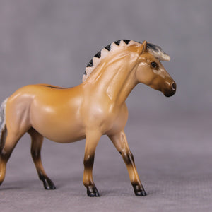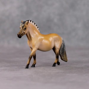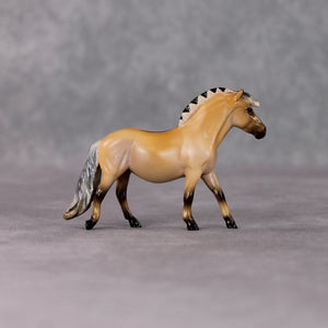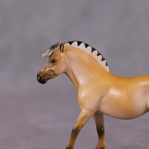 "Vafler" is all done up in her Fjordey Fjinery, featuring a customized lowered tail base and custom tail, and painstakingly customized and painted zigzag mane pattern. Kristen then finished her in a lovely shaded dun with all the primitive markings!