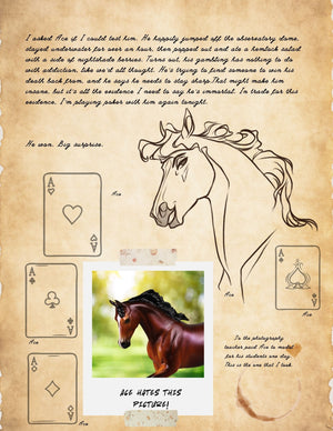 Experience Moonlight Madness through the eyes (and hooves) of Veronika Carter, our main character graduate student who is on a journey to meet as many part-horse cryptids as possible in pursuit of her master’s degree. She’ll meet friends, uncover old legends, confirm and/or disprove a few rumors, and learn more about characters from Moonlights Past. This journal tells you more about the story of every character run we are bringing you this year at Moonlight Madness in an engaging, hilarious, moving, and entertaining storytelling masterpiece. Written by Ellen Robbins with art by Ashley Palmer and characters developed by Ellen, Ashley, and Jess Hamill, this journal brings you into the world of Stone Horses creativity and demonstrates the care and thought that goes into each and every one of our pieces. Join us – the lore runs deep!