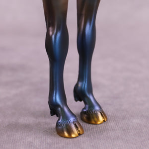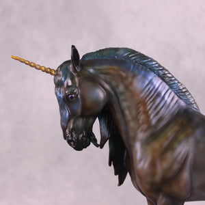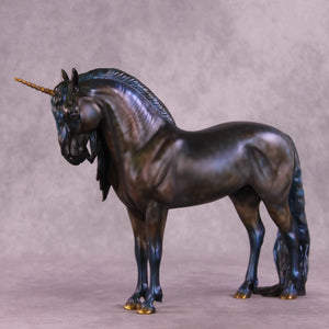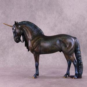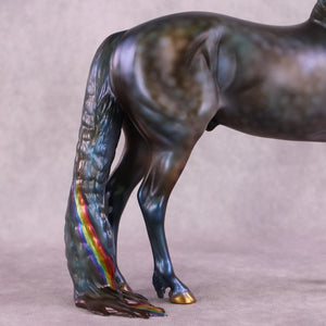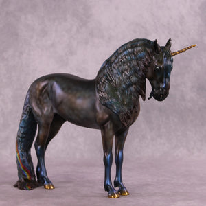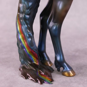 Afa is our Andalusian mold with his extra long puddle mane, tail, and forelock. Kristen gave him added small leg feather, a unicorn beard, cloven hooves, and a unicorn horn. Kristen painted him to a stunningly dimensional dappled blue grey with bronzey shading and a subtle lock of rainbow flowing through his extra long tail.