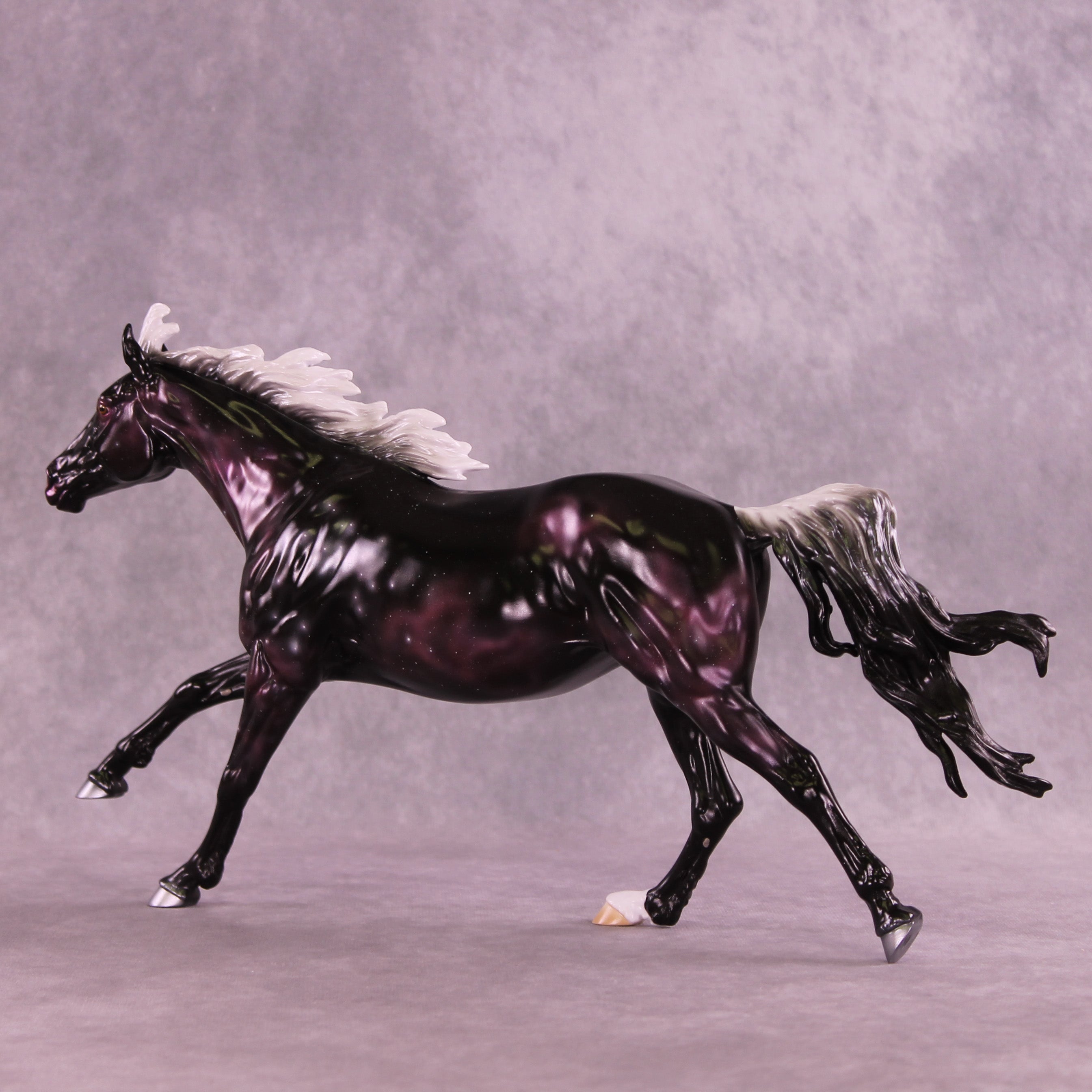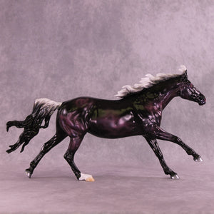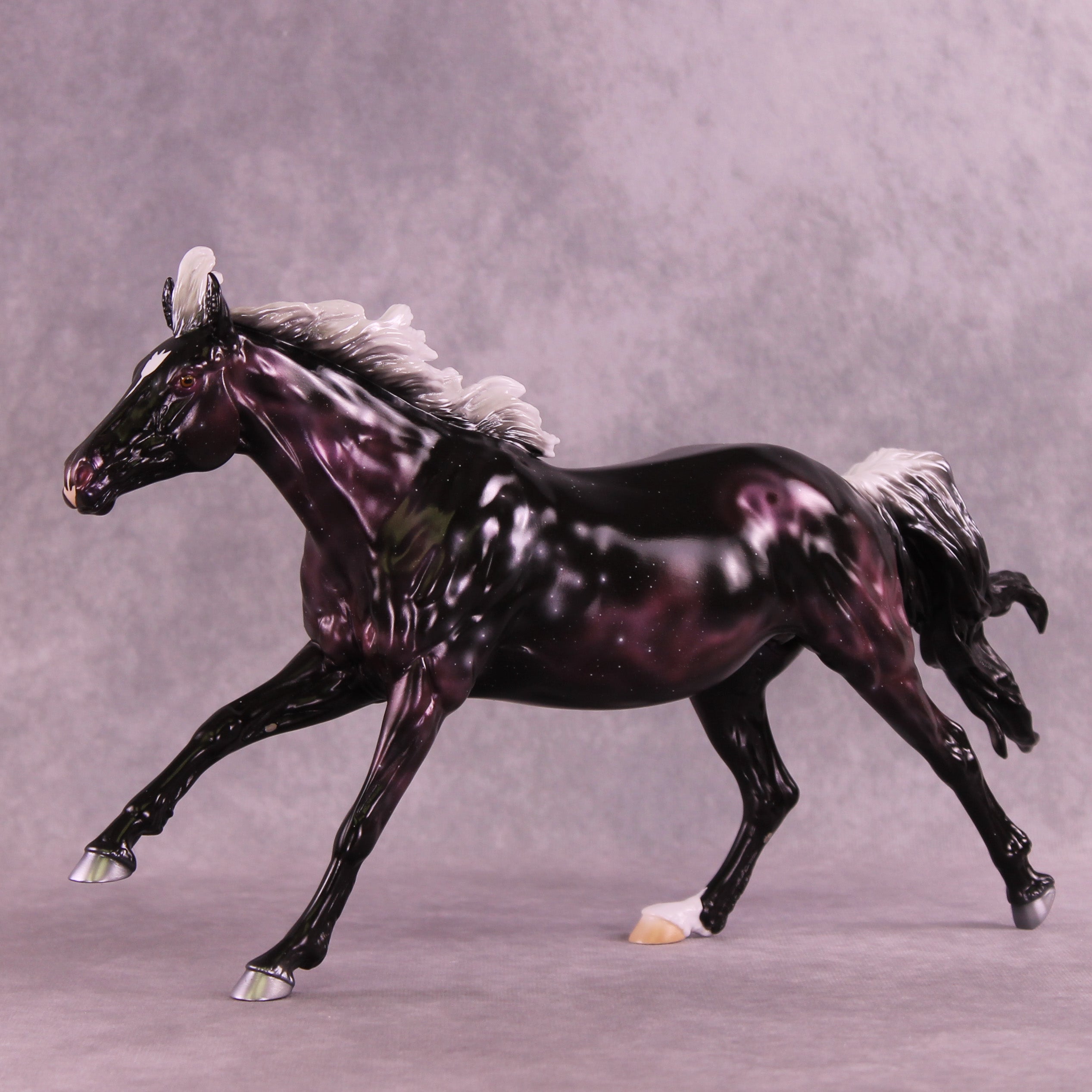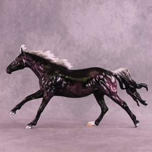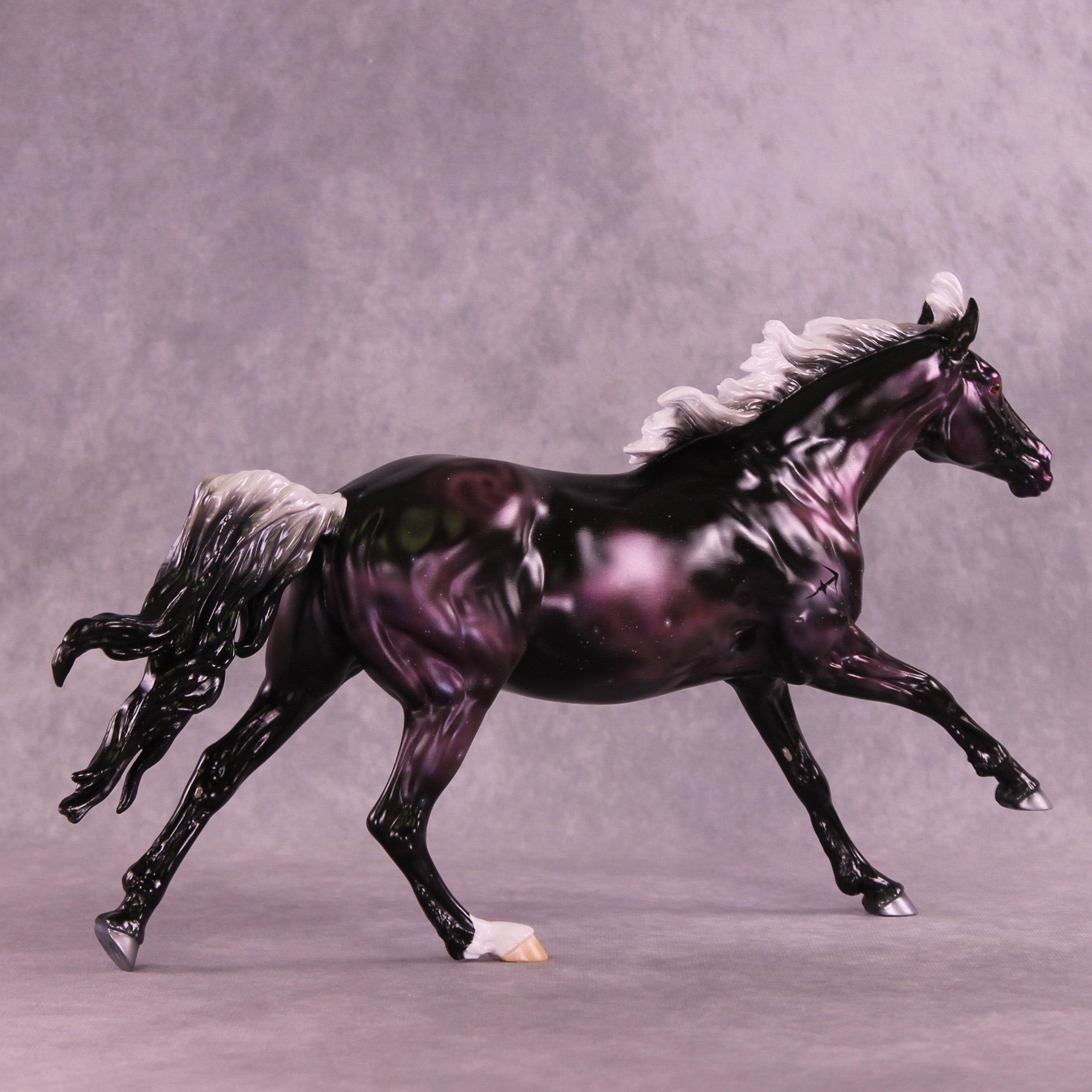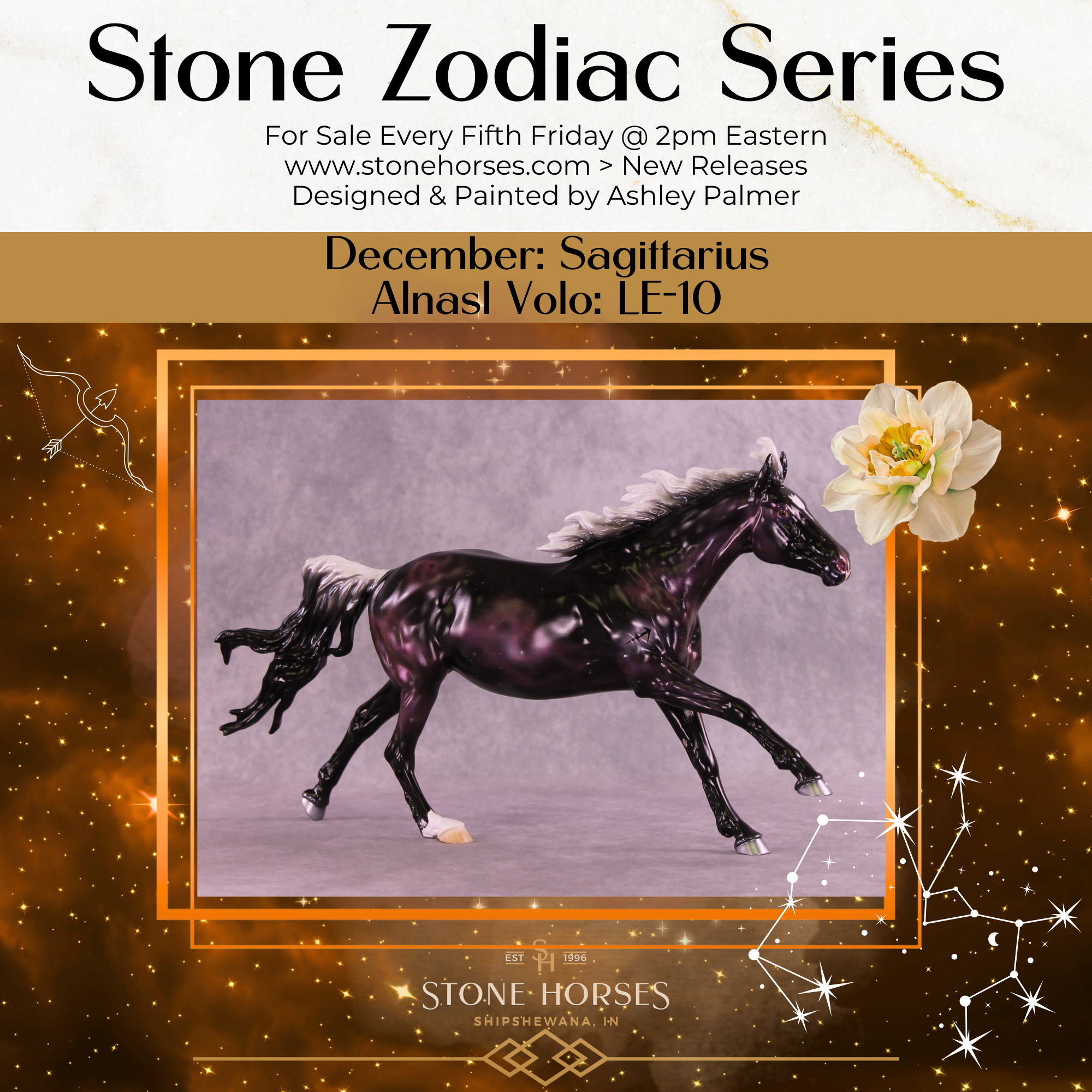 Alnasl is our decorator design this month, in a stunning galaxy nebula design with red, black, and silver elements, which represent Sagittarius being a mutable sign. She features black holes, the Sagittarius constellation, and the Sagittarius sign brand. She sports forward-facing ears and a long mane and tail. She is named after a star in the Sagittarius constellation, which means "sword" in Arabic. She is available in satin or glossy finish in a limited run of 10 pieces.