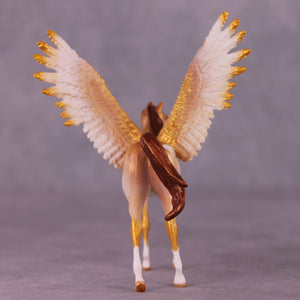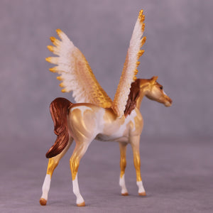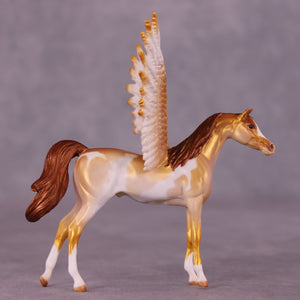 Aquila is our Chip Arabian with a drastic customization to a Pegasus, with a lowered and turned head, swishing tail, and of course added wings at the shoulders. Kristen painted him to a toasty creamy gold pinto with tons of shading and shimmer, especially in his mane, tail, and detailed wings.