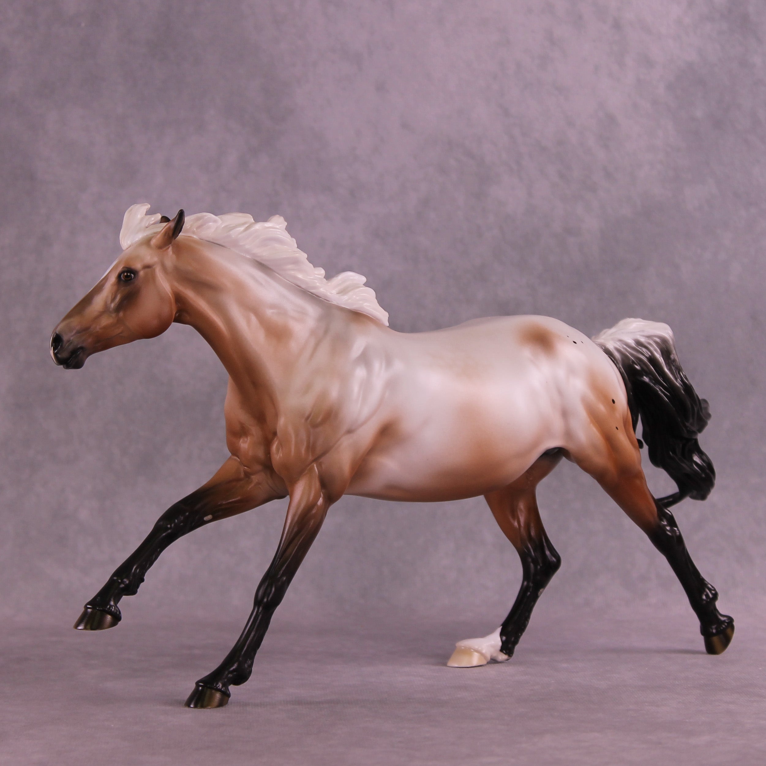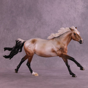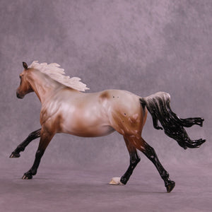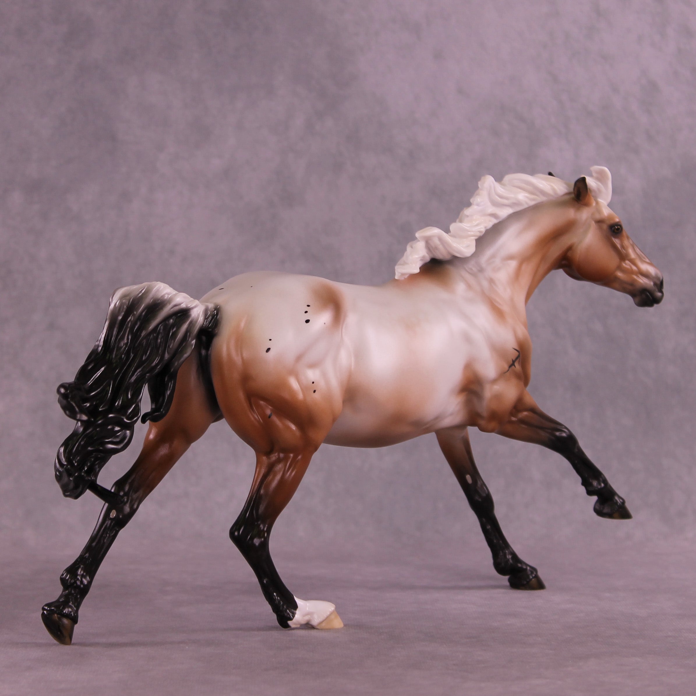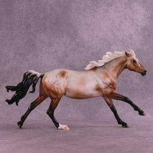 Ascella is our realistic design this month, with a turned head, pinned ears, and a windswept tail, finished in a bay varnish roan appaloosa with etched markings, including a snip on her nose reminiscent of an arrow, and an optional Sagittarius sign brand. She is named after a star in this sign's constellation. She is a limited run of 10 pieces and is available in all finish options.