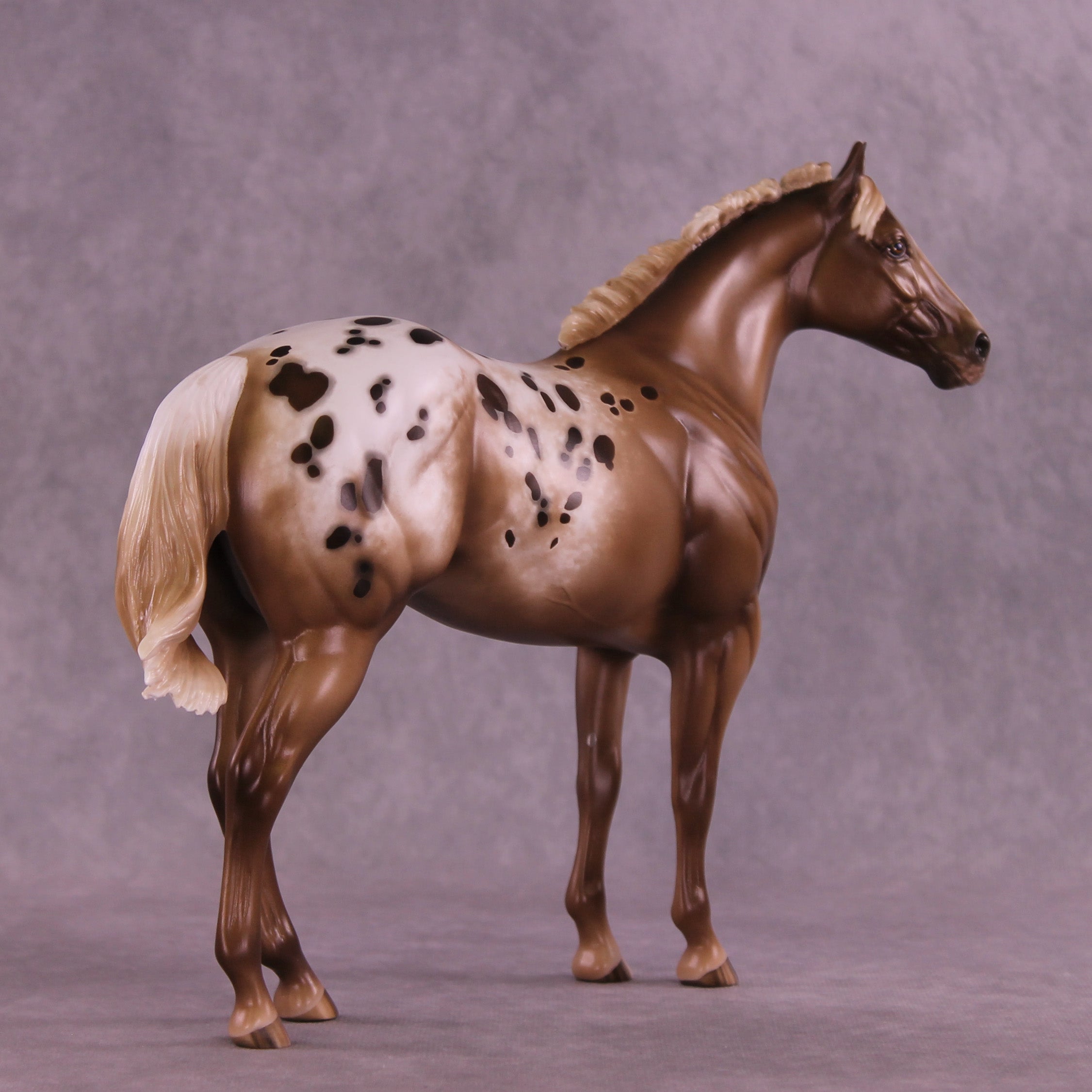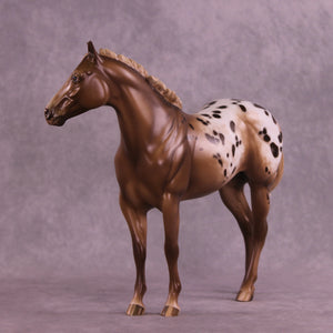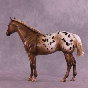 Beat Blast begins on our Ideal Stock Horse mold, customized to have a short standing up mane and forelock, plus extra short customized tail twisting in the breeze. Sheryl painted him to a glorious sorrel appaloosa with flaxen mane and tail, with just the right balance between hair level detail and softness that her work is so well known for. This piece is available in all finish options.