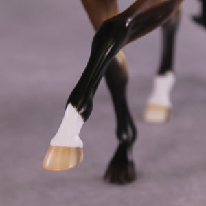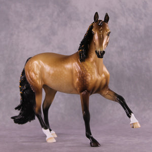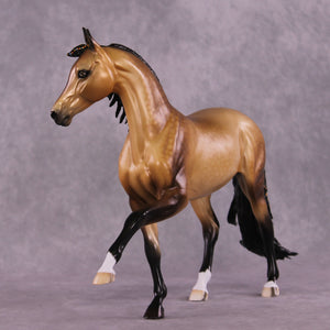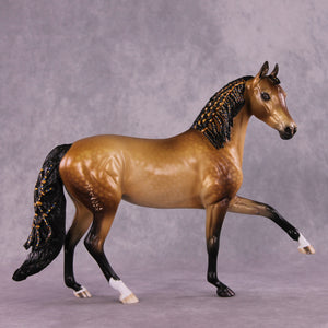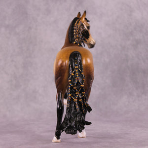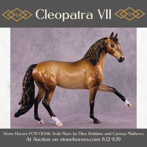 Cleopatra VII is a gorgeous Arabian Mare by Ellen Robbins, an elevated addition to the Classic Literature Series for August. Her dappled sooty buckskin coat features etched hieroglyph motifs, reflecting the character’s role as Egyptian queen. Lavish beaded details in contrasting gold and teal embellish the impeccably customized lattice braided mane and tail by Carissa Mathews, in addition to an elegantly raised front leg and changed gait. Ellen and Carissa collaborated to create an opulent beauty unmistakable as royalty.