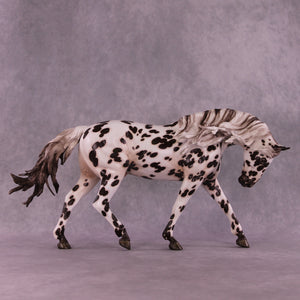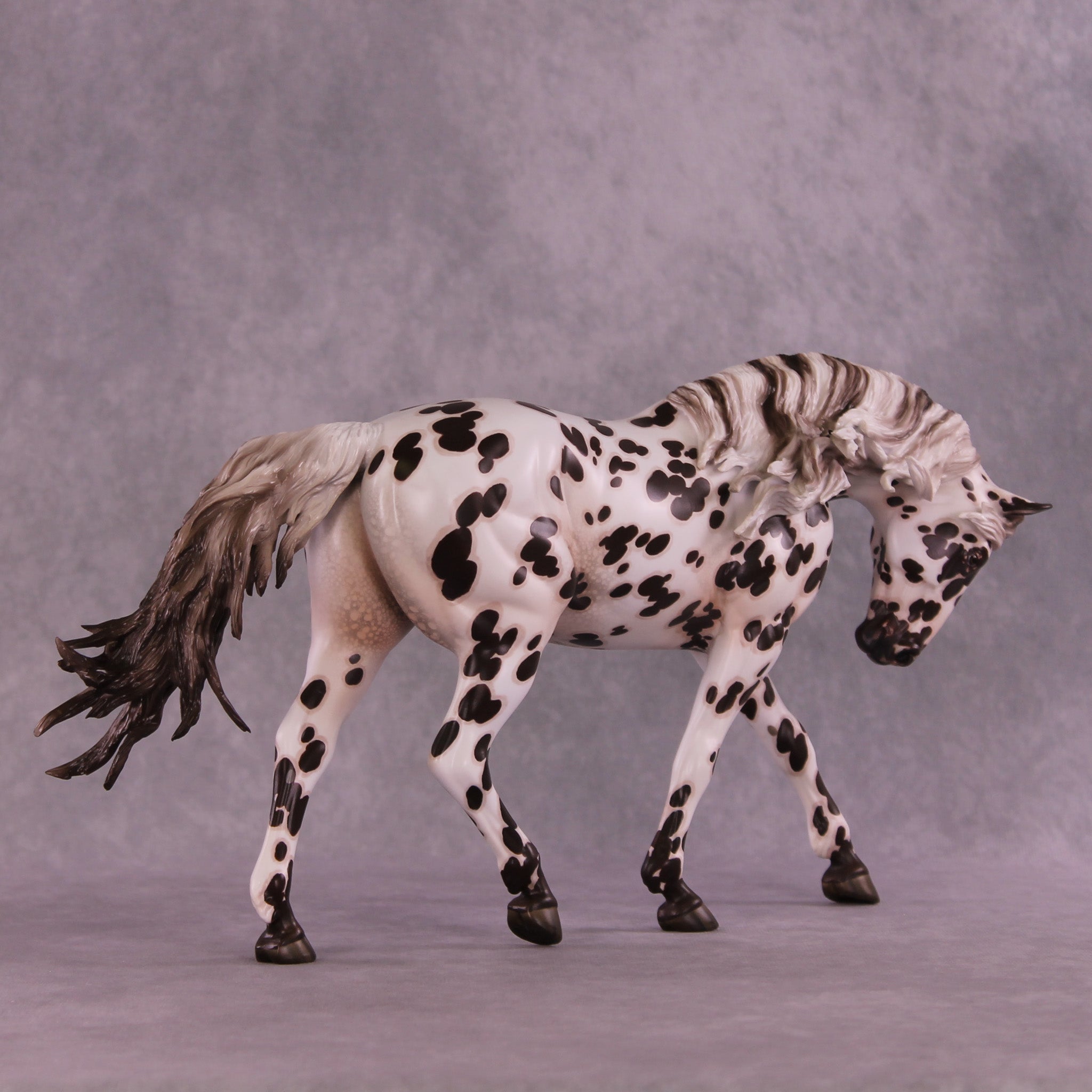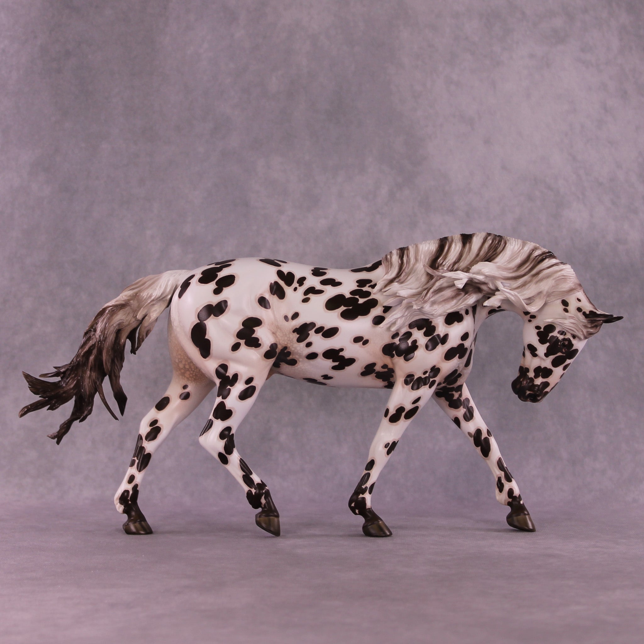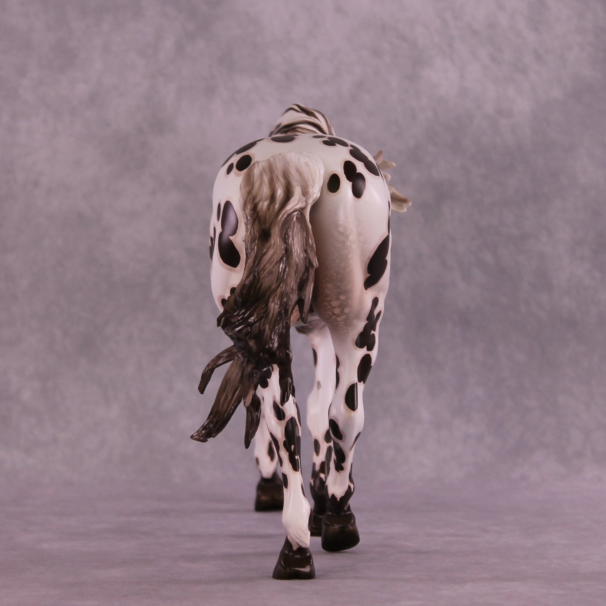 Carissa worked with our Irish Draught sculpture for this piece, giving him a huge dramatically lowered, turned, and tucked head and neck position. He also has a whole new mane, tail, and forelock with extra tendril detailing! Jess painted him to a gorgeously detailed liver chestnut leopard appaloosa, complete with heavy mottling, haloed spots, pinking and shading in his white areas, and more – this piece is a true standout.