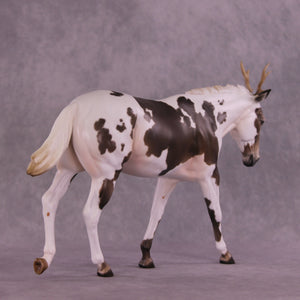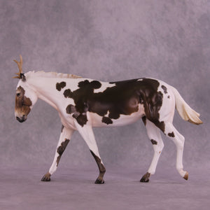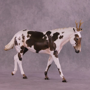 Translating to "Rabbit-Deer" in Spanish, this piece by Jess Hamill and Matt draws inspiration from many places - specifically, from a piebald white-tailed deer and arctic hare, shedding its winter coat into it's spring color. Matt gave her all new airplane ears and hand-carved antlers, plus a customized short mane and shortened tail. Jess finished her in a gorgeous soft brown piebald pinto with incredible soft shading, detail, and etching throughout! You may recall this piece from Moonlight Madness 2024, and it’s true – she is back up for auction, now with a slightly more satin finish than the first time around.