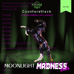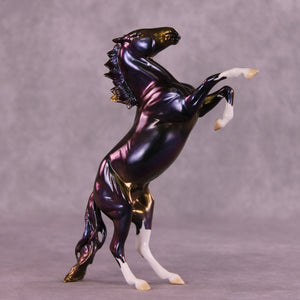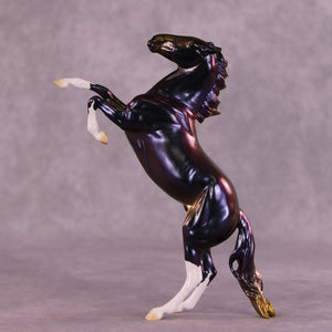 Matt worked with our Pebble Mustang sculpture to create this new take on a classic pose! He has customized front legs to be in a matching tucked position, and a sassy head and neck turn that changes his whole outlook on life. Ellen painted him to a gorgeously detailed dun with a dorsal stripe, leg barring, and dramatic shading through his whole design. He is available in all finish options.