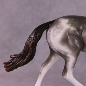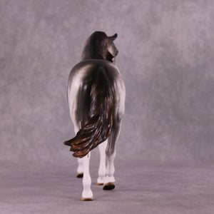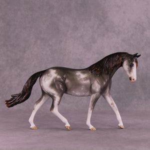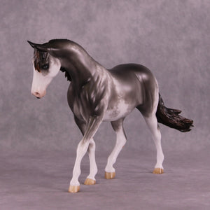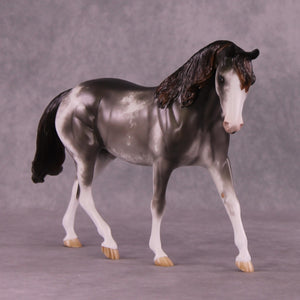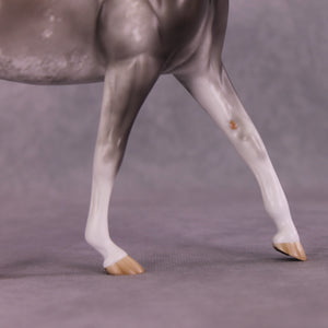 Donovan is our favorite pony mold with an adorable head turn and tuck by Mona, who also gave him her signature long and tendril detailed mane, tail, and forelock. Sheryl packed in the detail on this piece, including her extra detailing in the face she always does! He has beautiful detailed sabino markings, hoof stripes, gorgeous grey with warm ends shaded mane and tail, and more.