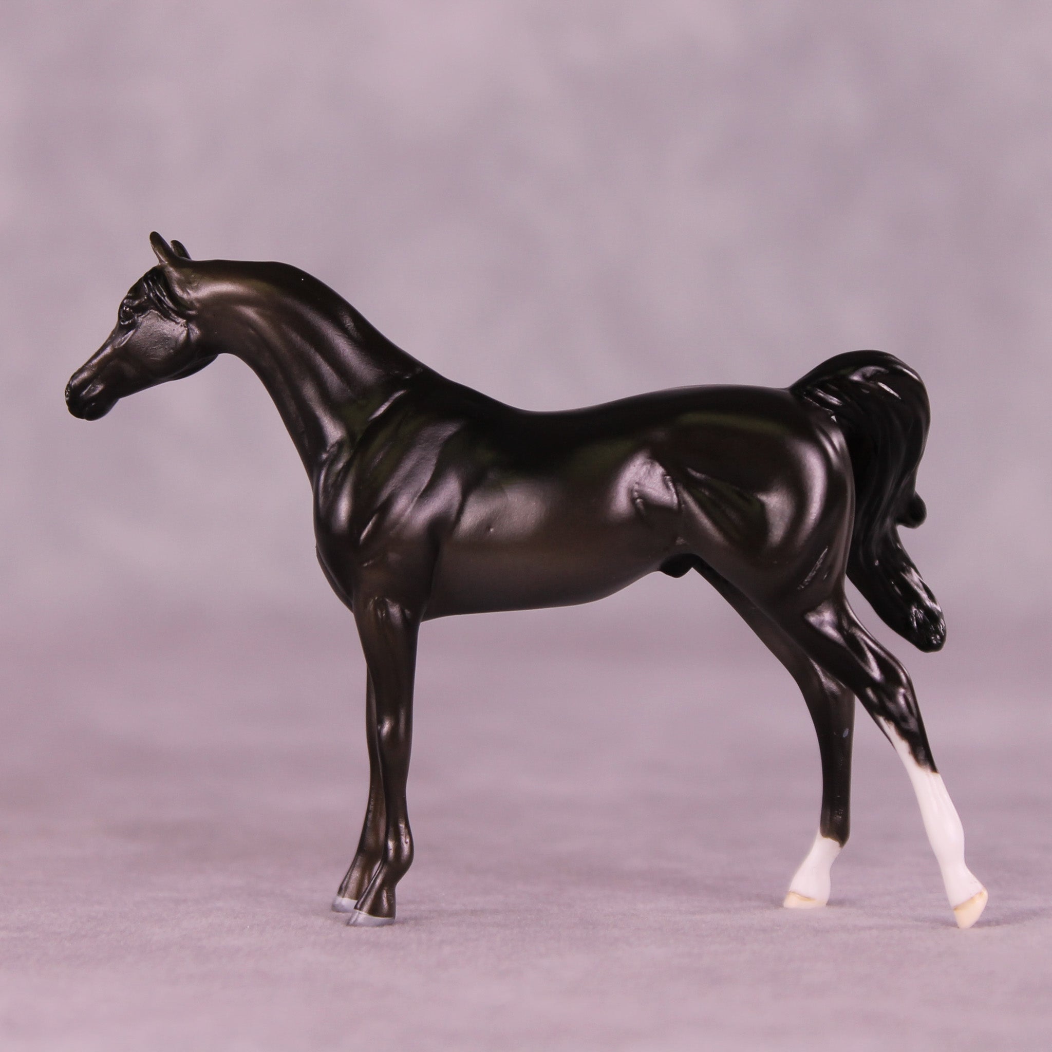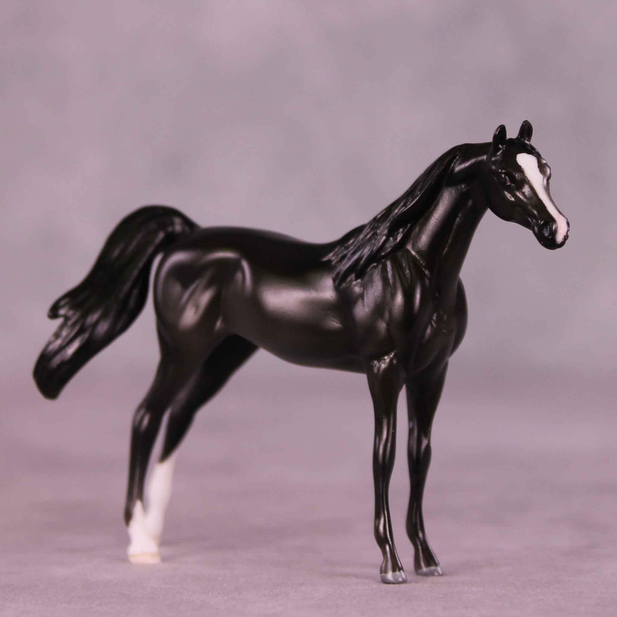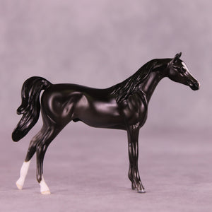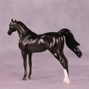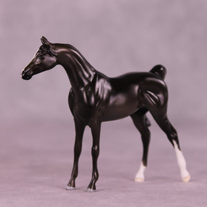 His counterpart is elsewhere in this collection, but you can’t have a collection of Arabians without a Black Stallion! Tiffany transformed our Chip Arabian into this stunning shaded black stallion, with a dropped and turned head and neck, swishing tail, two socks, and a blaze. He glows!