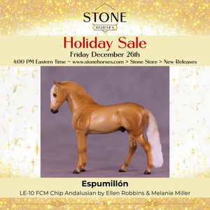 When we were planning this event, Mel made us two possible customizations on the Chip Andalusian to pick from - and, well, we loved them both so much that we picked both! This lovely guy features a big dramatic customized tucked head with a slight turn, with his ears left forward attentively listening. Ellen painted him to STUNNING dappled palomino with gorgeous shading that does a wonderful job of highlighting this lovely little sculpture. His mane and tail have creamy realistic shading, and he has no white markings - an ideal Andalusian. He is available in all finish options.