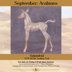 The sweetest baby unicorn you ever did see! Tiffany took our Arabian Foal sculpture and gave her cloven hooves, a baby unicorn horn, new rounded unicorn ears, a customized lion style unicorn tail, and then finished her in the most gorgeous shades of golden pearl with shimmering rosey tones. She looks like she is stepping right out of the pages of a storybook.