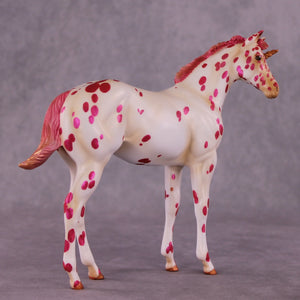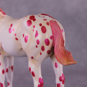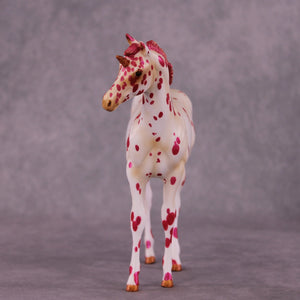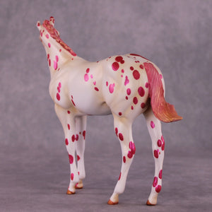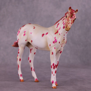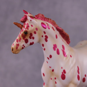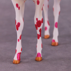Hānau Hope is a beautifully customized Stock Horse Weanling with a turned head, swishing tail, cloven hooves, customized standing up mane and forelock, and baby unicorn horn perfectly fitting her young age. Kristen painted her to a stunning pink leopard appaloosa with tons of hand painted appy spots, gold shimmer, and rosy gold tones in her cloven hooves and horn. She is precious!