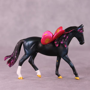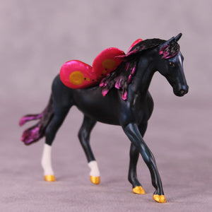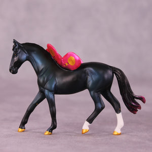 Just a Fairy is our Chip Warmblood sculpture with a big makeover! Kristen gave him a new customized long mane, a swishing tail with extra detailing, and hand carved fairy wings. She then painted him to a lovely deep blue-black with pink and gold wings, mane and tail tips, and golden hooves with two socks. He’s ♫ just a fairy! ♪