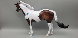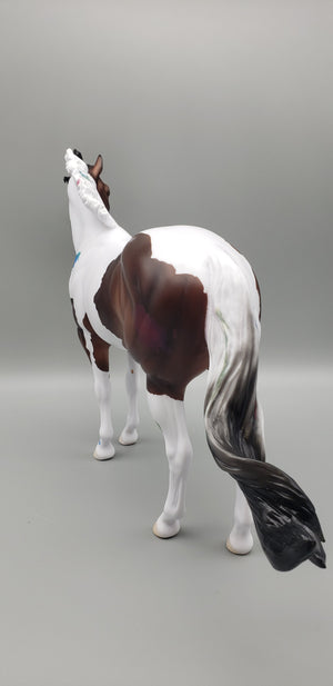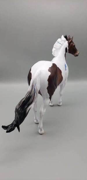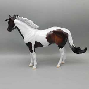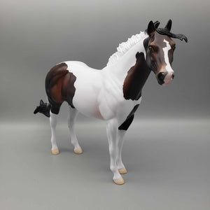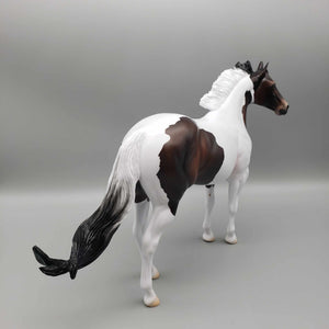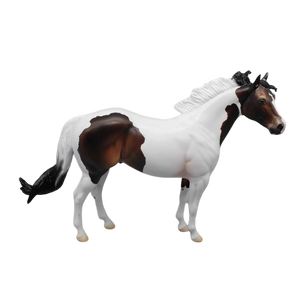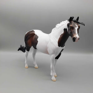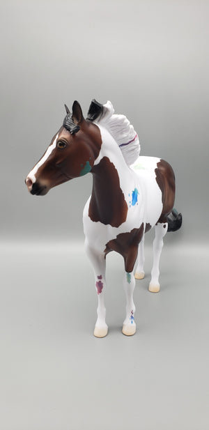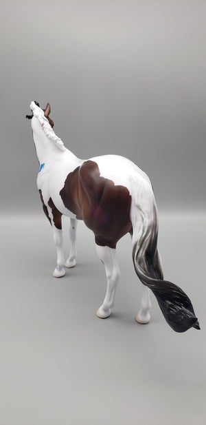 This exquisite model horse was carefully designed by Ashley Palmer and Ellen Robbins, inspired by Kokomo, the real-life horse that paints its own designs. The intricate details of the Kokomo Bay Tobiano Custom Ideal Stock Horse AoTH23 faithfully capture the spirit and beauty of the original. Its exceptional design and high quality make it a stunning work of art. Offered in two variations with the paint splatters or without there is sure to be a choice everyone can love as much as the adorable horse himself!