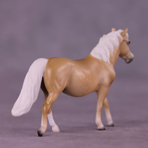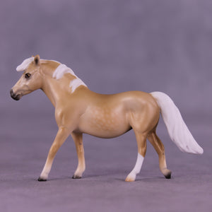 The Weird Sisters are three runs of 10 pieces each on our Chip Pony mold! Clotho is a shining metallic dappled bay, Lachesis is a warm and soft dappled palomino, and Atropos is a shining decorator shaded holographic design that comes glossed.