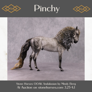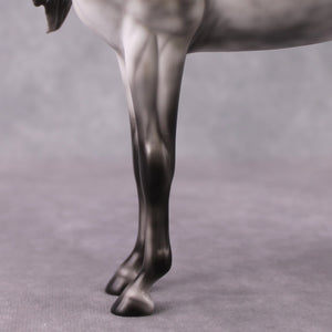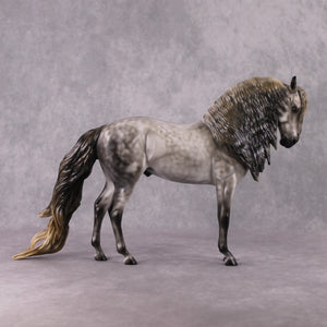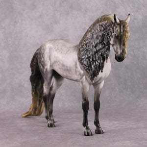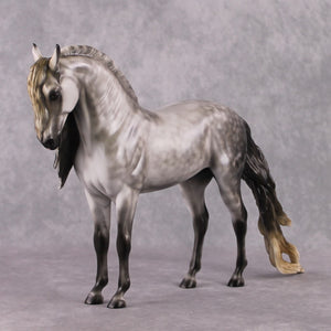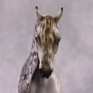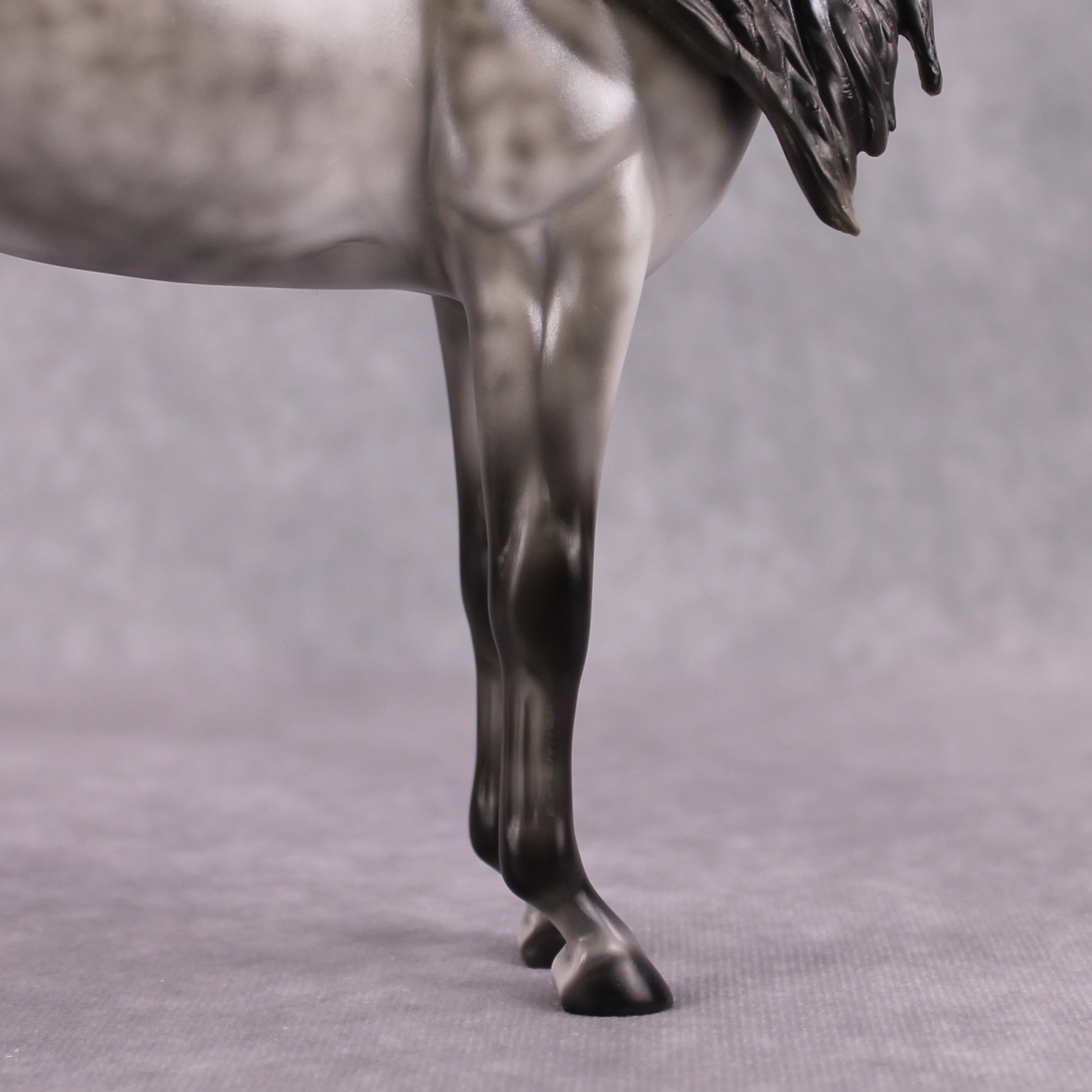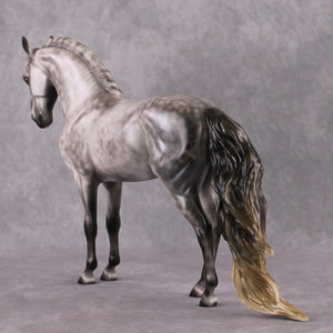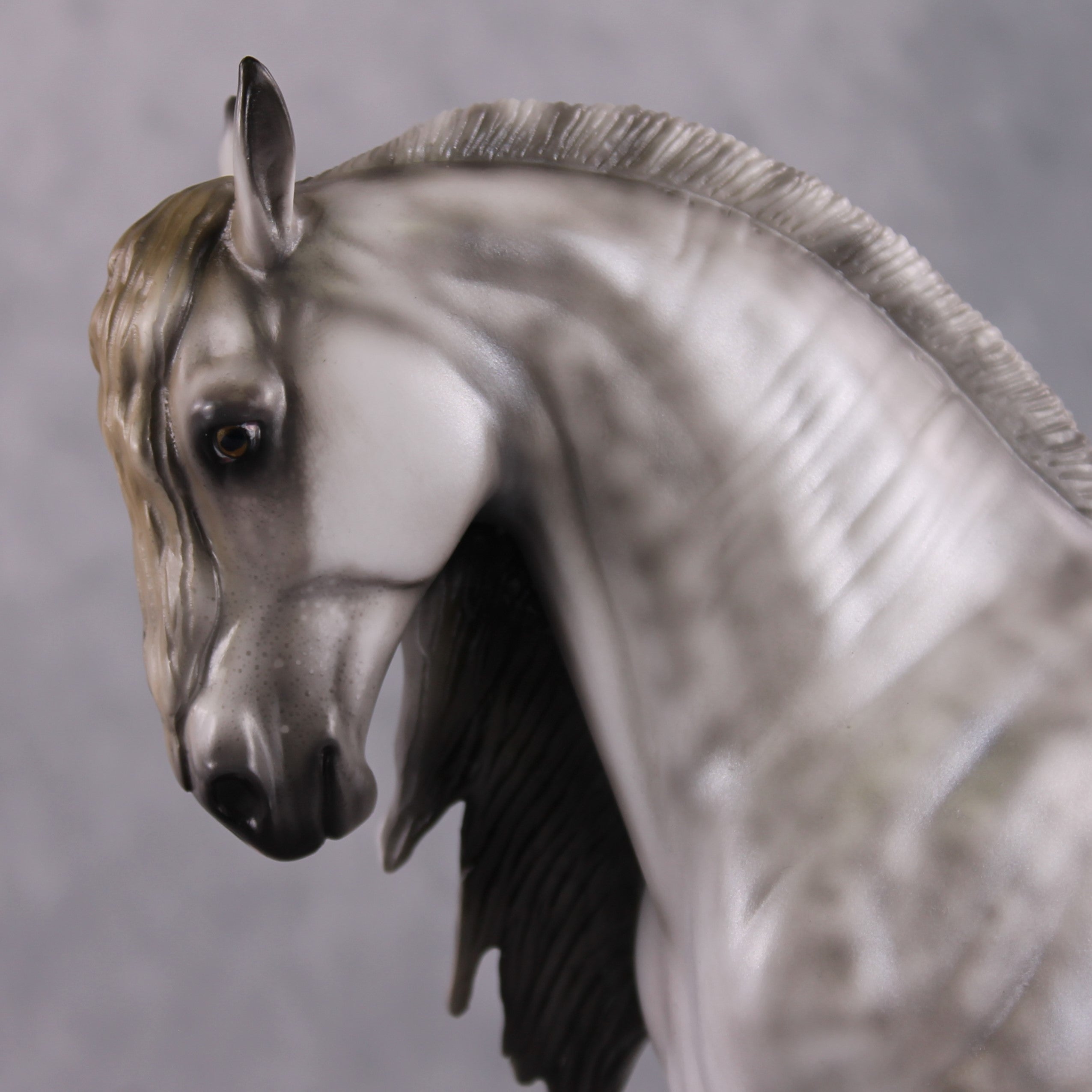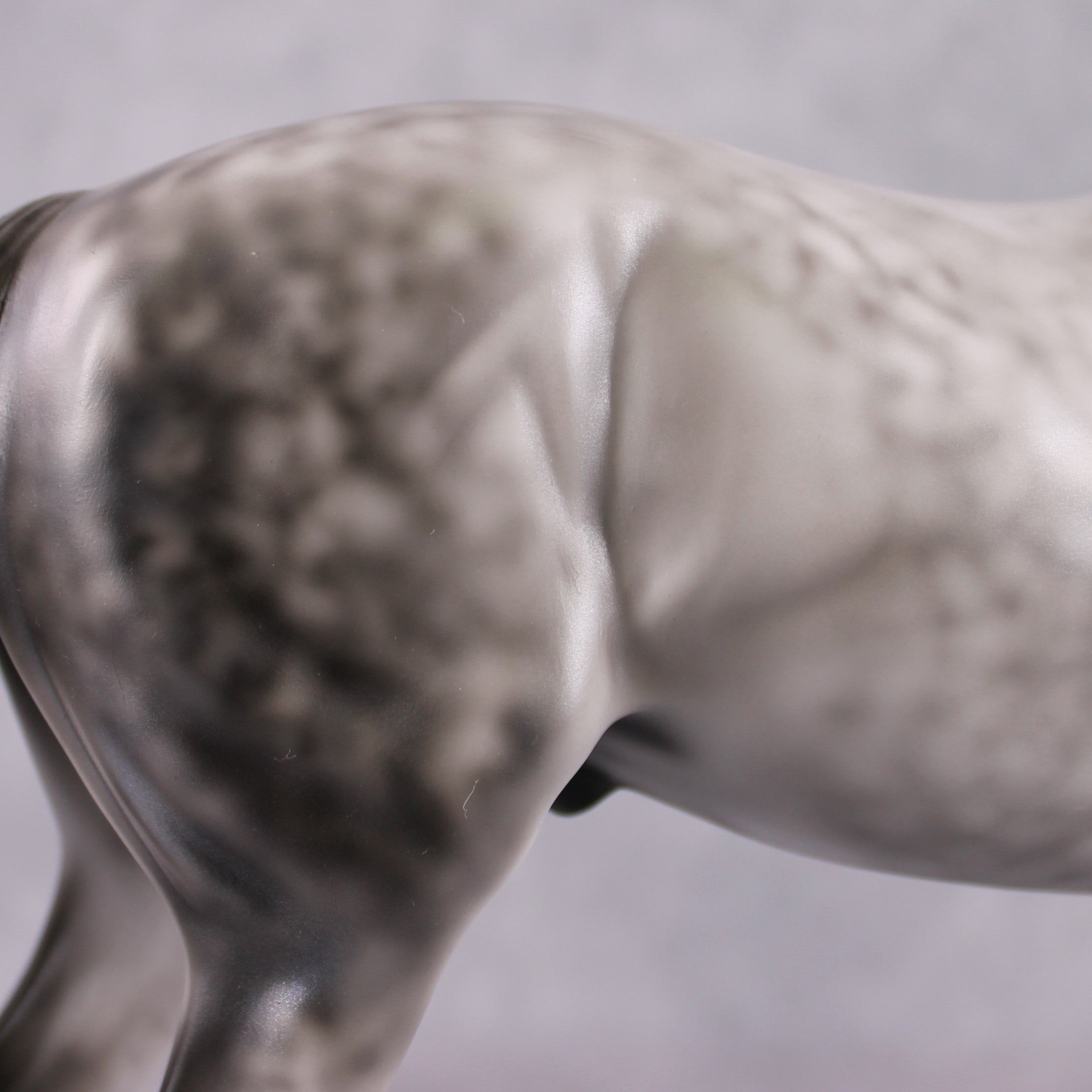“Pinchy” is the second of two grey Andalusian Stallions that Mindy painted while she was here, and she’s expressed that she’s so thrilled with how they both turned out. We think it’s amazing how even on a very first visit, each Guest Artist puts their own stamp on their models – this guy is a Mindy, through and through! He is a heavily dappled grey with no white markings, and tons of warm shading in his whole body – especially in his extra long mane and tail. We of course can’t wait to welcome Mindy back again for another visit, but this piece is the last of her work you’ll see for a bit – don’t miss him!