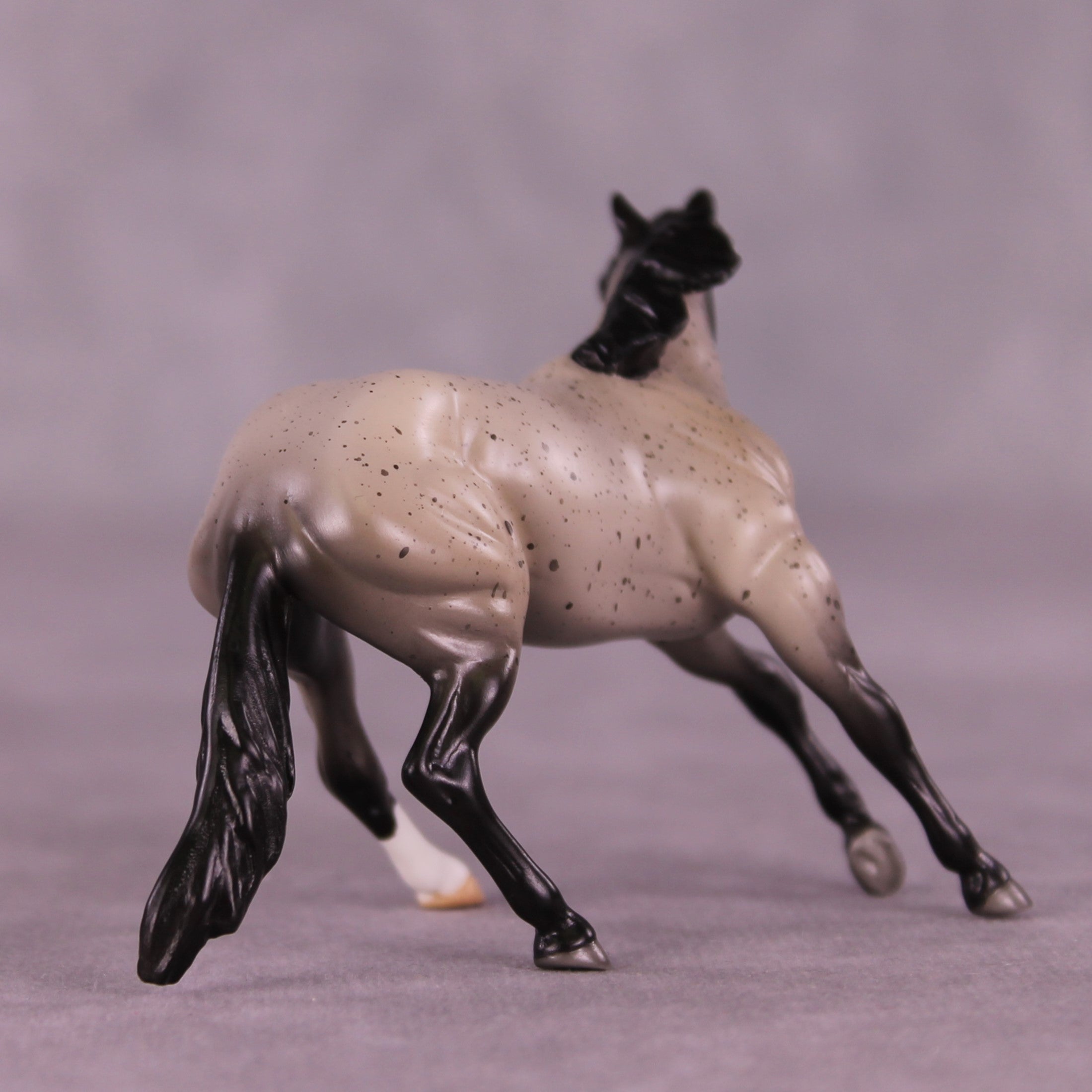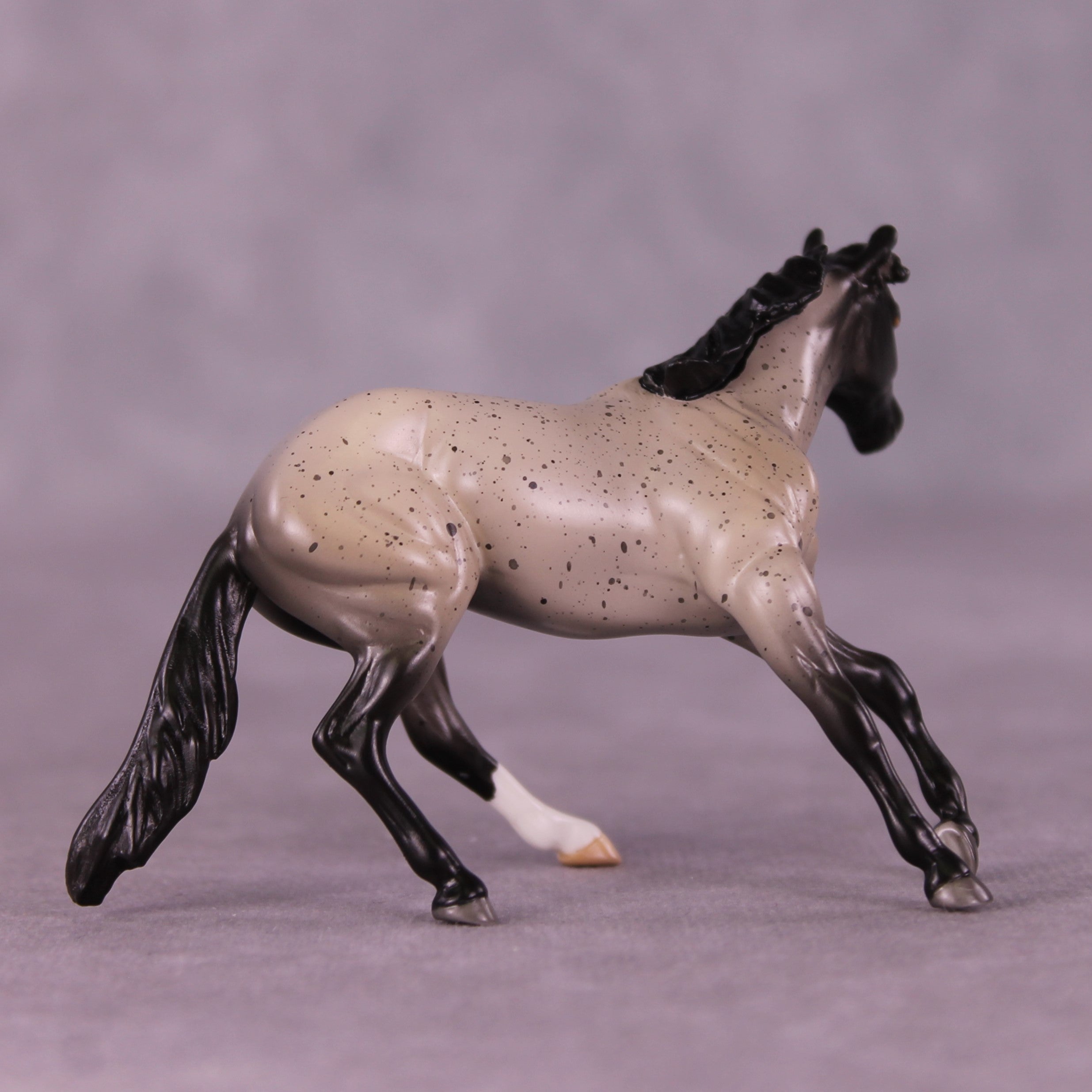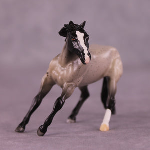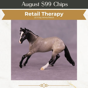 Retail Therapy is a beautiful flecked blue roan on our Chip Cutter mold, with one hind sock and a nicely pinked blaze.