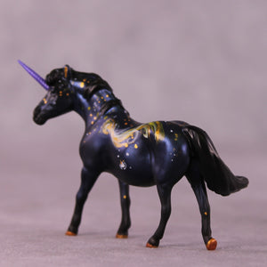 Stella is our adorable Chip Pony mold with a sweet customized turned head and swishing tail. Kristen painted her to a lovely starry night purple and dark blue decorator with hand painted starry night swirling, golden hooves, and a transparent purple resin horn by Mel Miller.