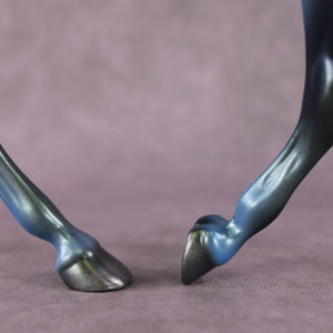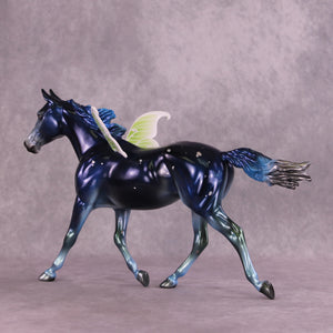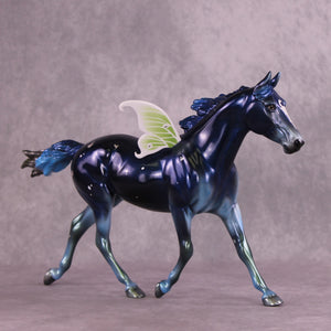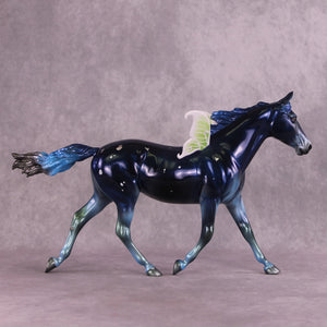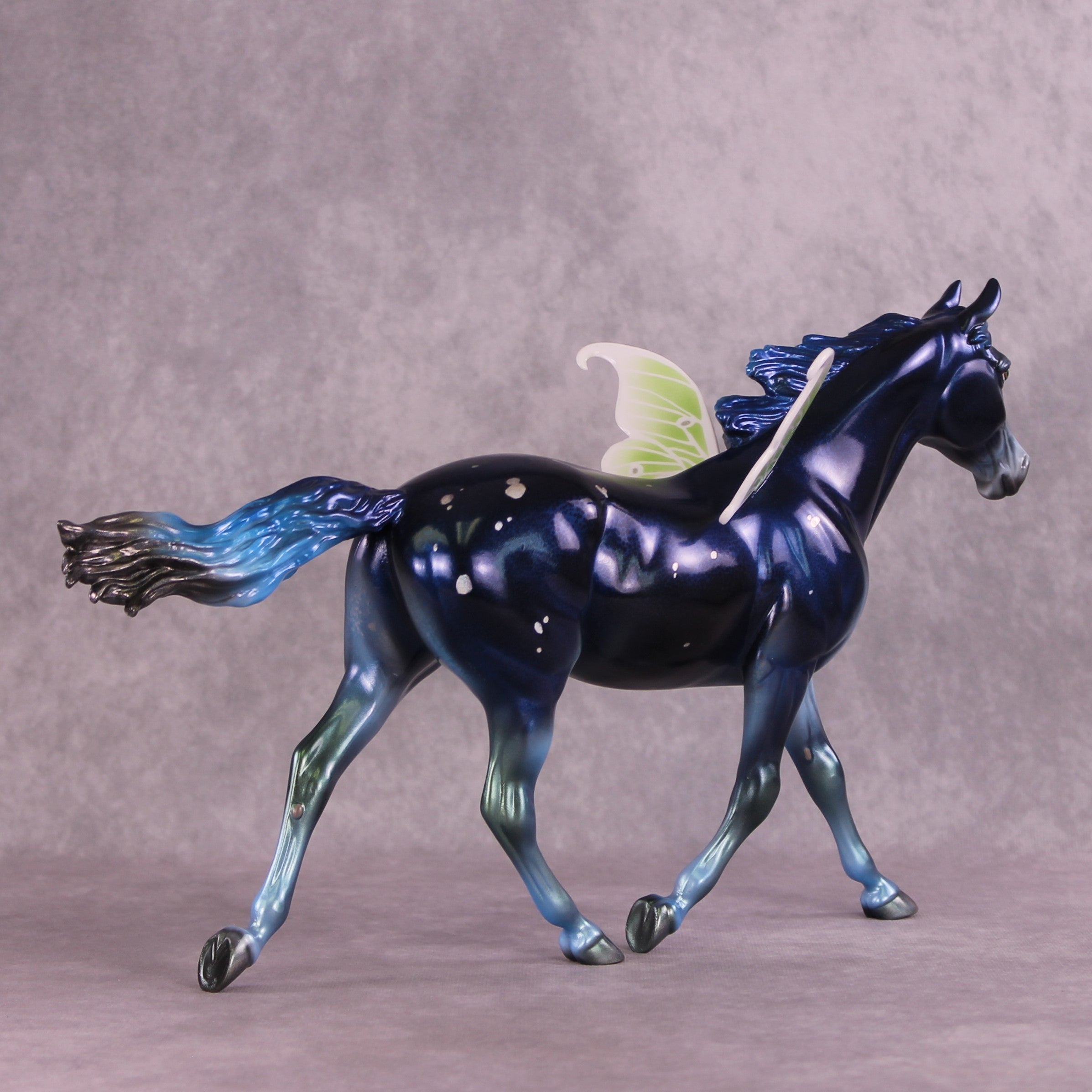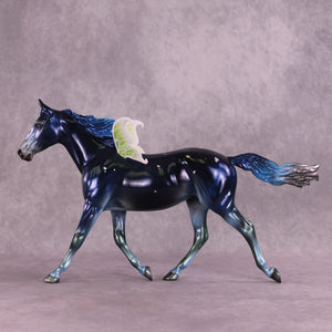 “Titania” is another partner piece to this week’s Classic Literature offering, featuring a flying mane and tail plus customized fantasy wings in the style of the ethereal Luna moth. Ellen painted her to a glowing blue holographic appaloosa with tons of deep water shading. She comes in glossy finish and no finish changes are offered on this piece.