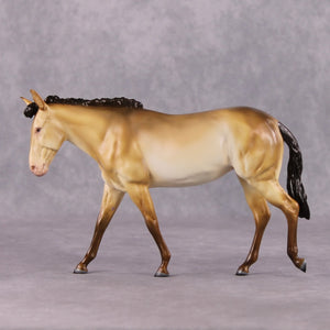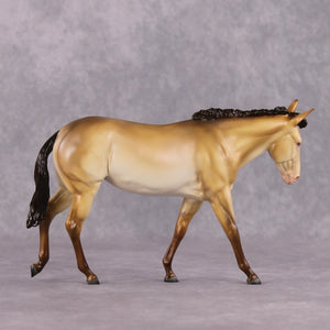 Tiffany took our Pebble mule and gave her a customized lightly turned head and neck and an ear twitch, and then finished her in a really cool shaded amber champagne. The dimension in this piece is incredible, and Tiffany really nailed this very difficult to execute color!