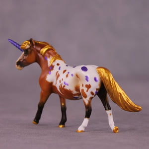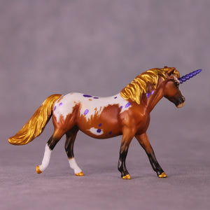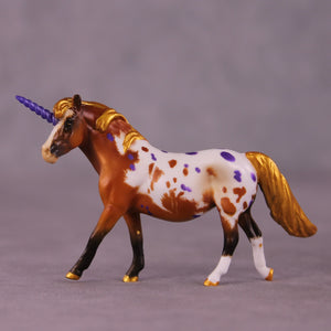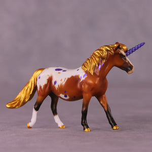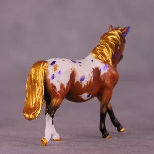 Violet is our Chip Pony mold and Kristen gave her a customized turned head, a raised front leg to change her stance, and a swishing tail. She then painted her to a really cool realistic and decorator color mashup, a bay appaloosa with golden shaded mane and tail and hooves, with purple appaloosa spots to match her purple resin horn by Mel Miller.