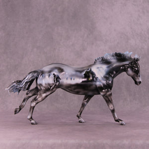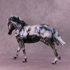 If this horse had a rating, he’d be PG-13. Kike has once again worked his magic – the depth of VERY SPOOKY field in this piece is nothing short of remarkable. You can practically hear the zombies trudging toward you through the mist, and some of them are FAR too close for comfort. Depicted on our Remington sculpture with his short mane, pattern flowing with the hair direction and finished in glossy, this piece is an October marvel.